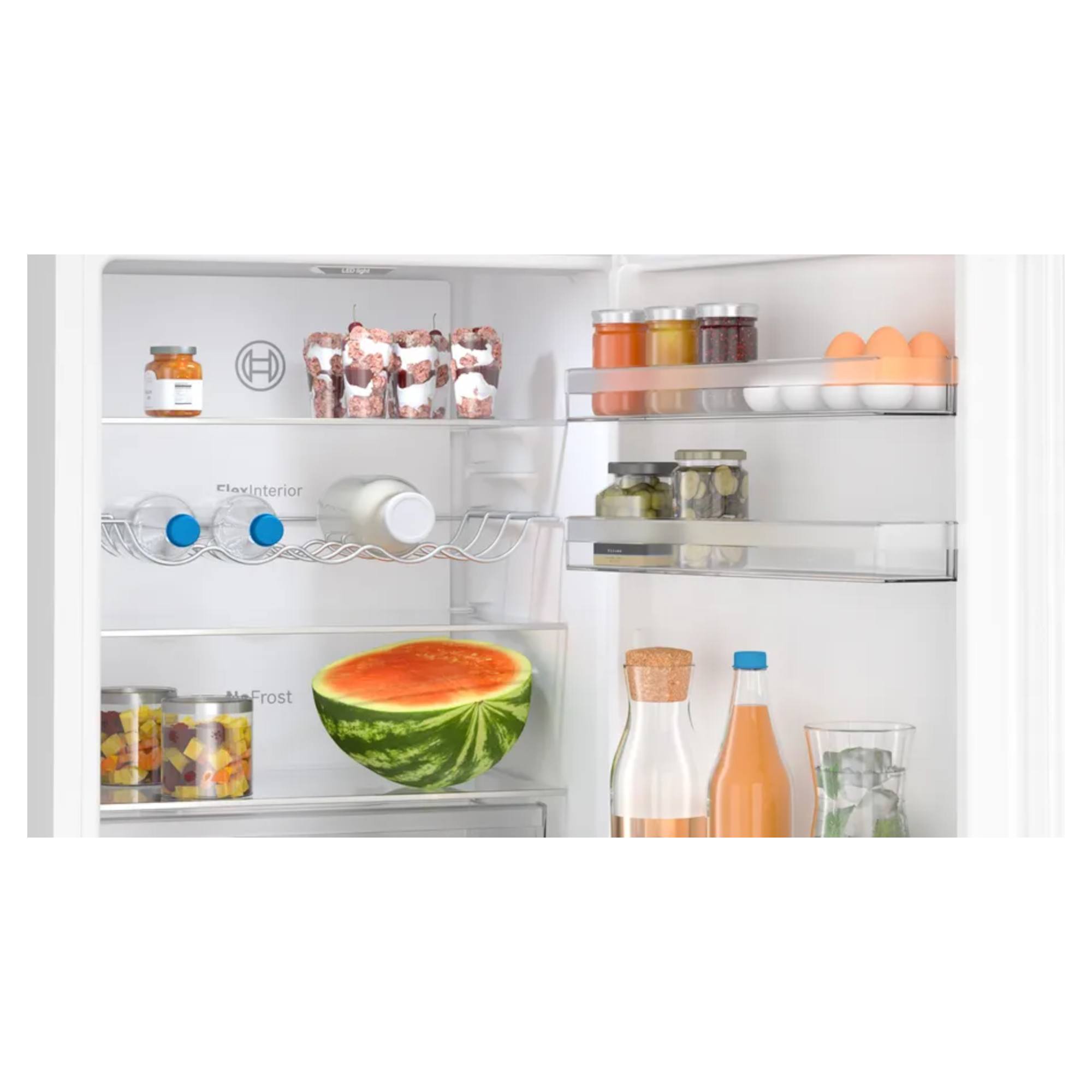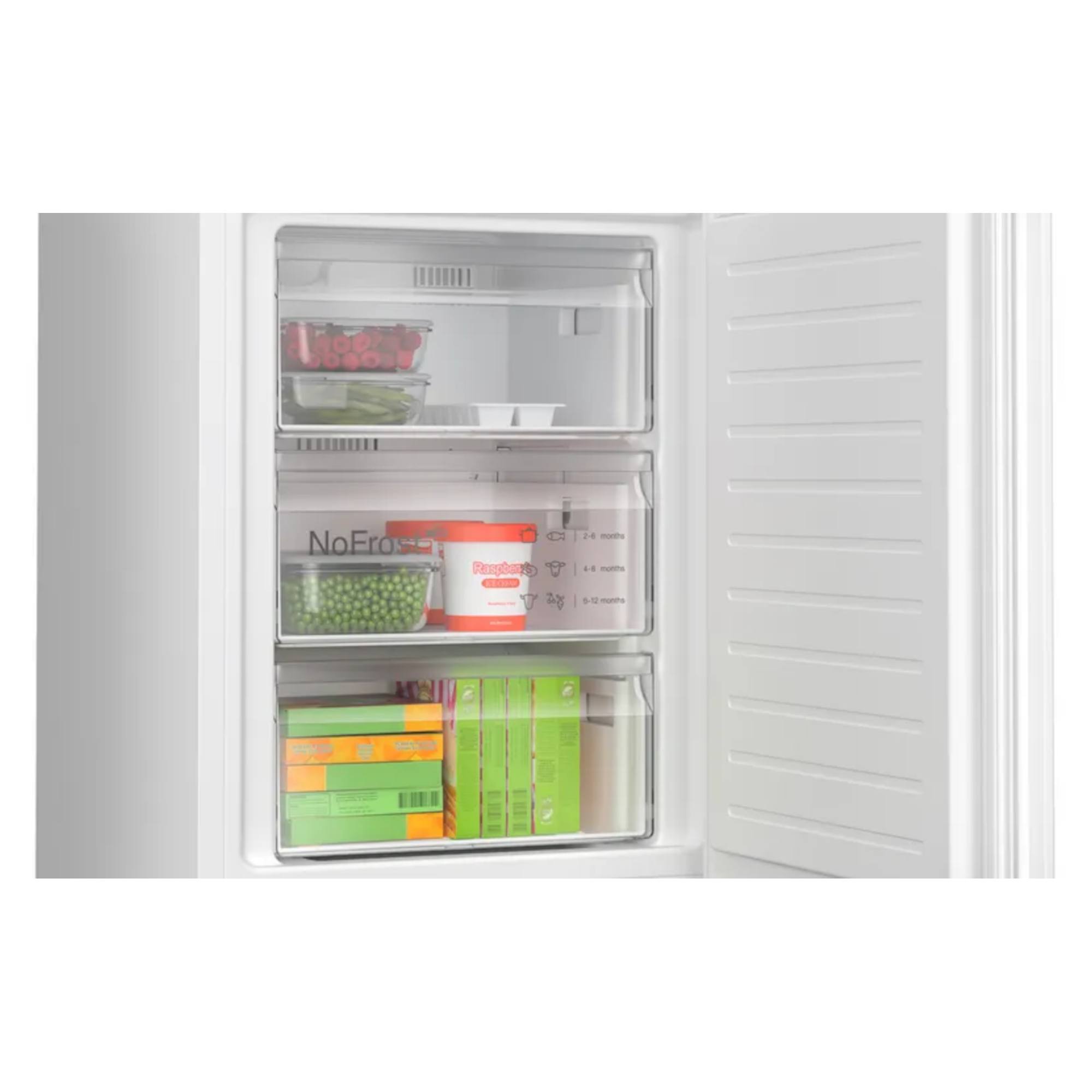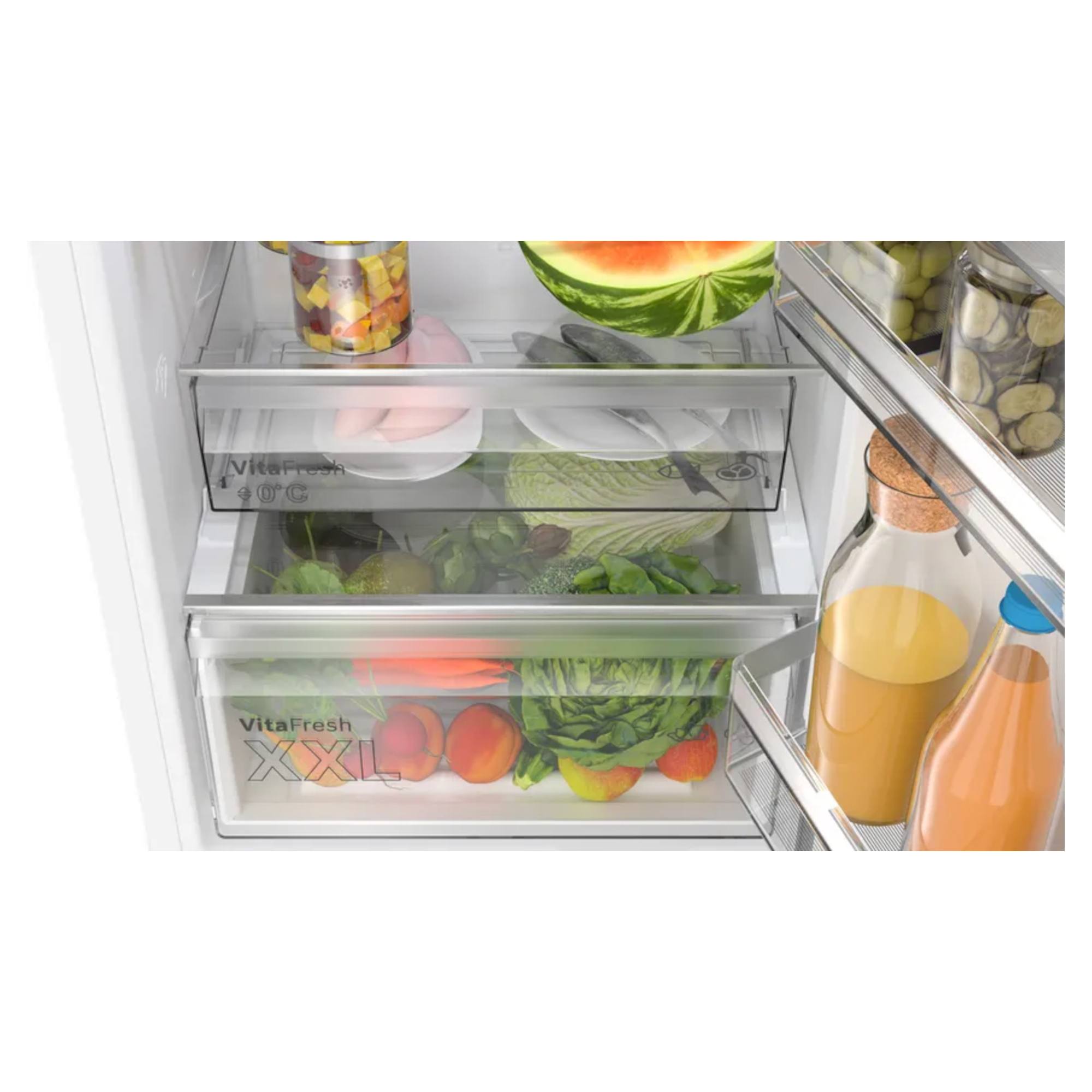 H: 1860mm x W: 600mm x D: 665mm Fridge 218L Capacity Freezer 103L Capacity No-Frost SilverBosch KGN362WDFG 60cm NoFrost Fridge-Freezer In WhiteNo need to defrost your fridge-freezer.Forget the hassle of defrosting. NoFrost maintains a steady flow of dry air throughout your fridge-freezer to prevent ice from building up. Its the end of the ice age, and the hassle of defrosting is gone for good.No need to defrost your fridge-freezer.Forget the hassle of defrosting. NoFrost maintains a steady flow of dry air throughout your fridge-freezer to prevent ice from building up. Its the end of the ice age, and the hassle of defrosting is gone for good.Place your fridge anywhere.Place your fridge wherever you want. Other standard fridge freezer models on the market need a distance of around 10 cm from side walls for doors and drawers to open. Thanks to Perfect Fit, ourfreestanding fridge freezer range can be positioned right against side walls and furniture. The fridge freezer width corresponds to the niche dimensions.Maximum freshness for your fresh foods.VitaFresh XXL Pro 0C offers the perfect storage environment for all your fresh food thanks to climate control and 0C technology. Fish and meat stay fresh for longer at a temperature of exactly 0C. And your fruit and vegetables benefit from an optimised climate.The fridge that keeps a constant temperature – everywhere.Uneven cooling in your fridge can greatly affect the flavour and longevity of your food. Thanks to the glossy backwall with MultiAirflow, humidity and temperature is evenly distributed throughout the cooling area, from the door bins to the back corners, which helps your food retain its integrity for longer.Keeps the contents of your fridge in the spotlight.LED lights bring a completely new lighting concept to fridges, guaranteeing even, glare-free interior illumination. LED lights use less electricity than conventional fridge lights and last an (appliance) lifetime.Food stays frozen, vitamins stay inside.In order to retain vitamins, nutritional value, appearance and flavour, food should be frozen as fast as possible. With the Automatic Super Freezing function you can freeze small food load faster whilst protecting your frozen items from defrosting. The freezer detects the temperature increase and automatically adjusts its temperature to guarantee the best storage conditions.