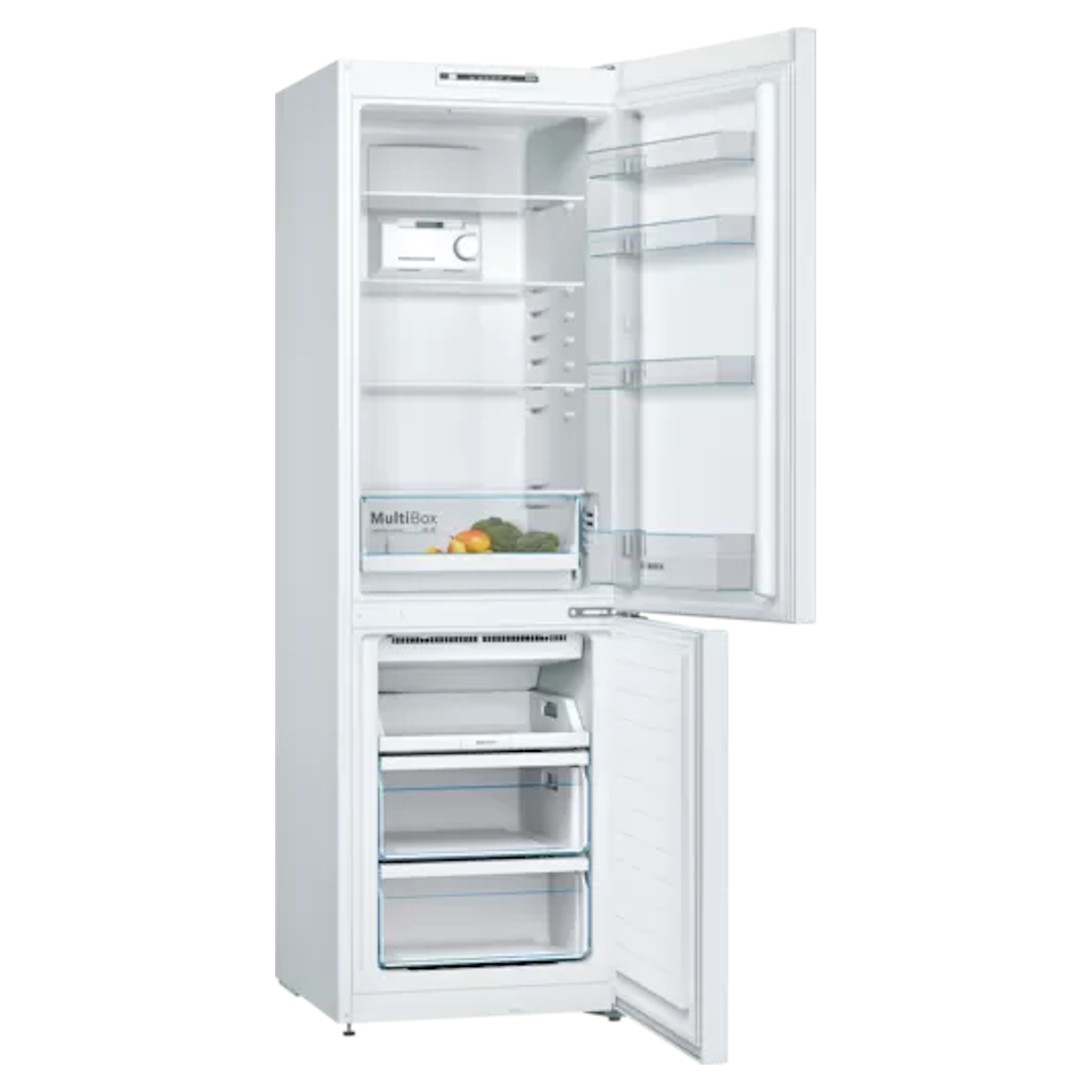 H:1860mm x W:600mm x D:660mm 216L Fridge / 89L Freezer 42dB Noise Rating No Frost E Energy Rating Bosch KGN36NWEAG 305L Capacity Fridge Freezer – White LED lights bring a completely new lighting concept to fridges, guaranteeing even, glare-free interior illumination. LED lights use less electricity than conventional fridge lights and last an (appliance) lifetime. Defrosting a fridge by hand can be very annoying and time-consuming. Thanks to our new fridges with NoFrost, you can easily remove this task from your to-do list for good. Unlike in conventional fridges, the air humidity in a NoFrost fridge is permanently collected in a central chiller unit, which automatically defrosts on a frequent basis. Thanks to the optimum storage conditions, your food preserves an ideal consistency; ice cream, for instance, is neither too soft nor too hard. A constant temperature in the fridge interior is a decisive factor in achieving more freshness and flavour. FreshSense sensors constantly monitor and control the ambient, fridge and freezer temperature.