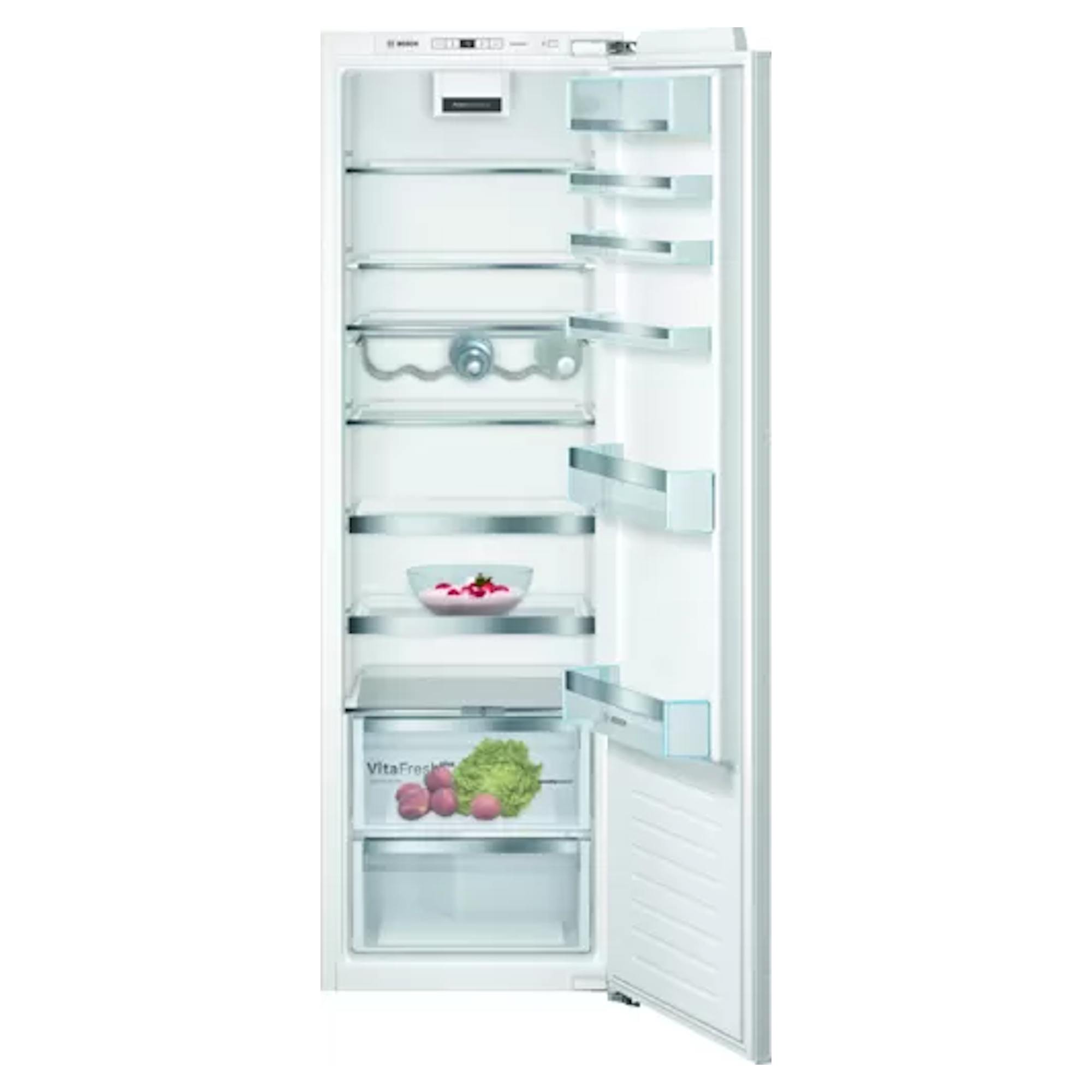 H:1772mm x W:558mm x D:545mm   Fully Integrated   319L Net Capacity Larger Design   37dB Noise Rating   E Energy Rating Bosch Series 6 KIR81AFE0G Built-In 319L Net Capacity Larder Fridge with Flat Hinge Choose the Bosch Series 6 KIR81AFE0G Built-In Larder Fridge for a effortless way to store up to 17 full grocery bags of fresh food and chilled drinks. Thanks to the divided Vario Shelf and the safety glass construction loading and unloading your fridge is simple and easy to access. Bosch’s FreshSense design ensure a perfect storage climate to keep your food fresher and tastier for longer. Use the MultiBox XXL in your new fridge to store extra salad, or even chill a whole watermelon. With the Super Cooling function you can lower the temperature in your fridge for a short time to rapidly chill newly added foods and after approximately 6 hours your fridge will return to its standard temperature. All this with bright and efficient LED lights, door open alarm and egg rack.