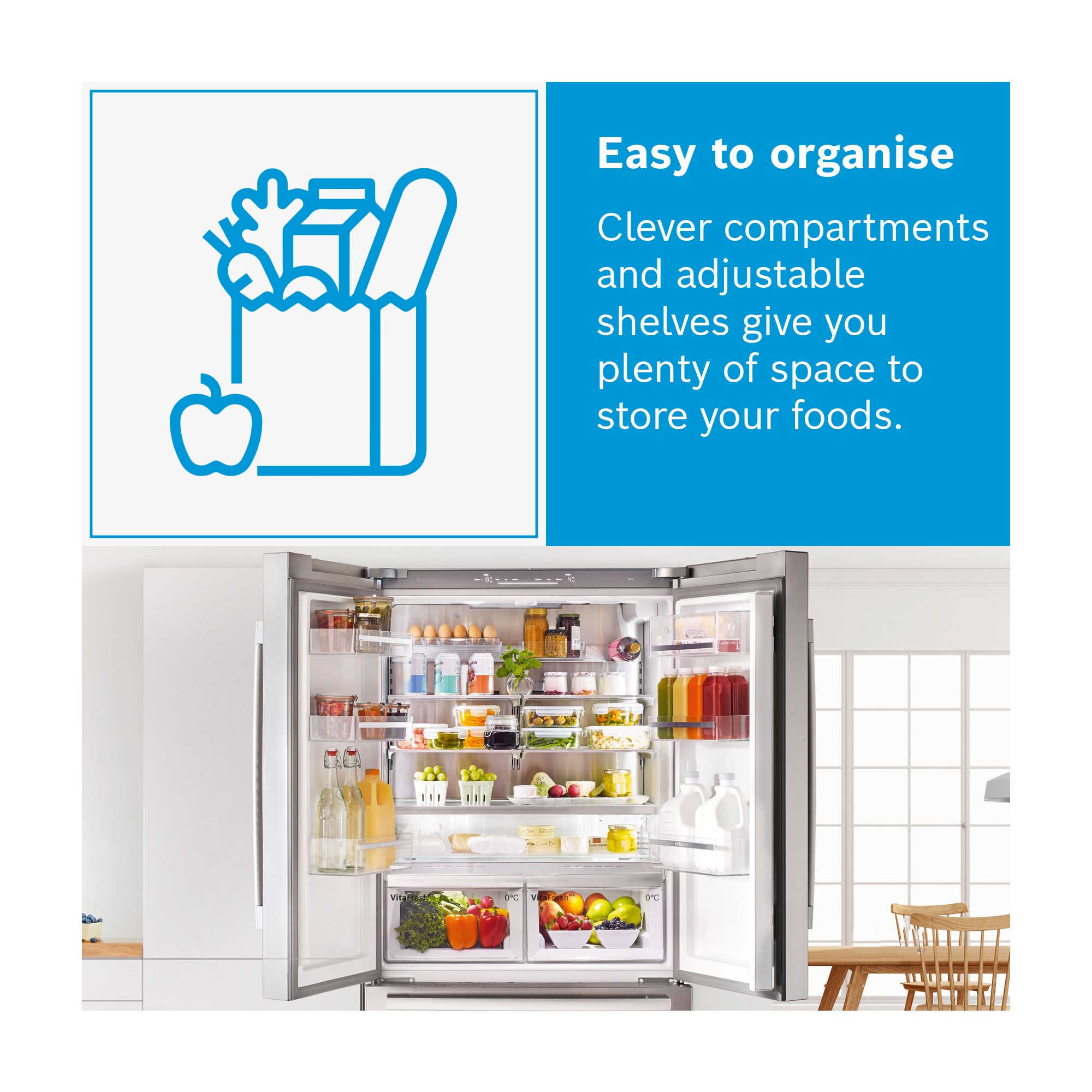 Please click here to read our American Style Fridge Freezer delivery guide before ordering.   VitaFresh box: efficient cooling to maintain freshness for longer   XXL capacity: extra space for your food when you need it   Metal backwall with MultiAirFlow: evenly circulates cool, fresh air to maintain consistent temperatures   HomeConnect: remotely monitor and control your fridge from your smartphone or tablet   Ice & Water Dispenser with tap connection: convenient ice maker for fresh cubes and chilled water The Bosch Series 8 KFF96PIEP Frost Free Fridge Freezer will keep your food fresher for longer thanks to the impressive technology it has to offer. It has the VitaFresh drawer separated by two air humidity zones. The dry zone is perfect for storing meat, cheese and fish, and the moist zone creates the perfect climate for your fruits and vegetables. The Airfresh filter neutralises the unpleasant odours inside the fridge, so you can stock up on aromatic cheese and no one even needs to notice. And the filter tackles bacteria, so your food stays healthy and protected. Thanks to the SuperCool technology you can rest assured that your groceries are cooled to optimum temperature quickly – a feature you’ll appreciate when you come back from the supermarket. Keep your food in a great condition even when you’re away from home. By activating the Holiday mode, you’ll protect your frozen goods. Plus you’ll save money on energy bills. Whether you’re looking for dinner ingredients or a yogurt pot for an afternoon treat, the glare-free LED light illuminates the whole of fridge, making it easy to keep stock of your groceries.