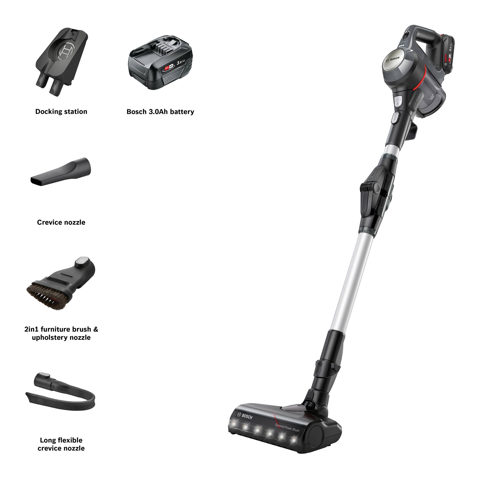 Lightweight 2.9kg Design Rechargeable Cordless Vacuum 0.3L Bagless Capacity Crevice Nozzle, 2in1 Furniture Brush, Upholstery Nozzle & Long Flexible Crevice Nozzle 40min Run Time AllFloor DynamicPower Brush with Integrated Floor Lights Docking Station Graphite Finish Bosch Unlimited 7 BCS711GB ProHome Cordless Vacuum Cleaner – Graphite Bosch’s BCS711GB delivers outstanding results on carpet, tile, parquet, stone, and laminate floors. It features the All-Floor Dynamic Power brush to pick up 99.9% of dust particles. And, as the floorhead includes LEDs, you can spot and remove dust even in the darkest corners of your home. The cordless cleaner has a 40-minute run time and can clean your entire house on one charge. Recharging takes just five hours, so it’s ready to use when you are. In addition to a handheld option, this system comes with a crevice nozzle and a 2 in 1 furniture and upholstery tool for quick clean-ups and hard-to-reach areas. Featuring a Flex Tube, you can clean under low furniture with ease. With the lightweight and compact design of BCS711GB, not only is it great for cleaning, but it’s also practical and stylish as well. Weighing just 2.8kg, this model is easy to move around. Three power levels ensure that no dust will be missed while a stylish dark graphite finish will fit into any decor. The Easy Parking Clip enables you to secure your vacuum against a chair, sideboard, or table without it tipping over while you take a break from cleaning. Due to Quick Stand technology, the nozzle and tube stand by themselves when used in handheld mode, and you can detach the nozzle with your foot without having to bend down, and with a dust capacity of 0.3-liters, you’ll spend fewer trips to the bin, and the docking station makes storing your cleaner simple.