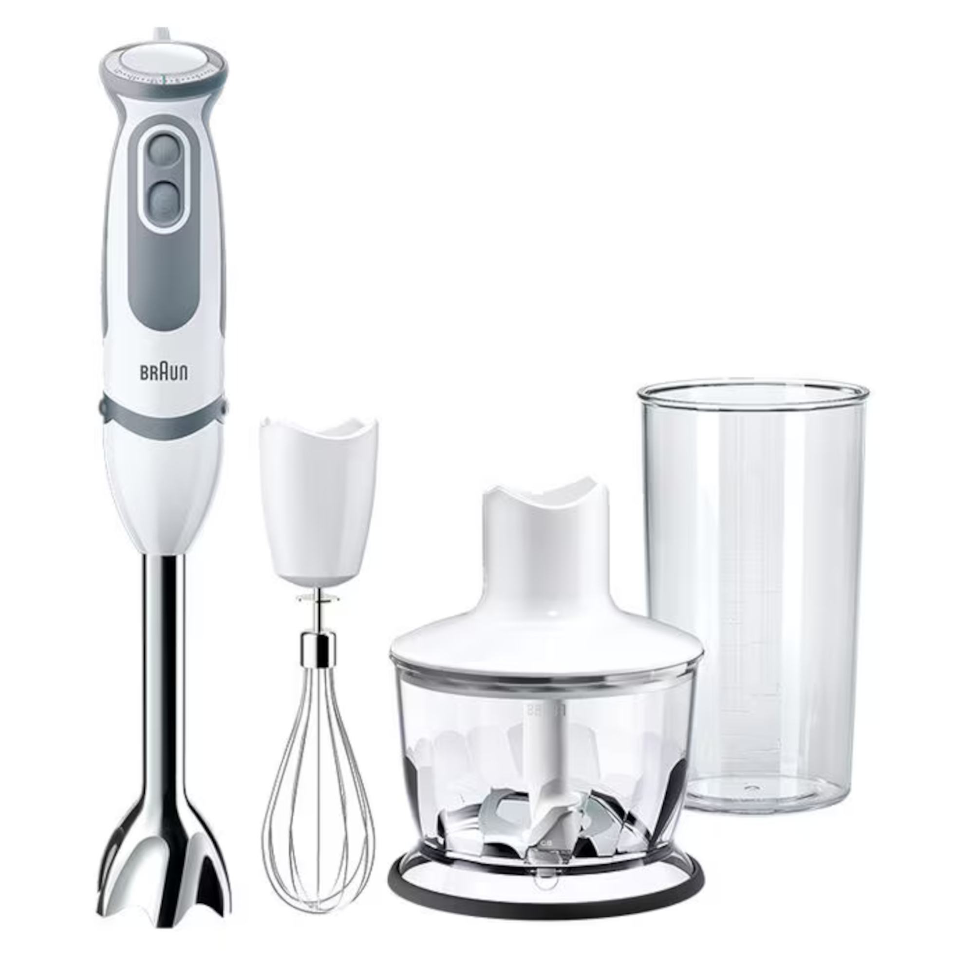 1000W Power 21 Speed Controls Splash Control Technology Ergonomic Shape & Soft Grip 500ml Chopper/600ml Beaker Compatible with wave cut attachments Product Description Discover the versatility and power of the Braun MQ5235 MultiQuick 5 Vario Hand Blender, a kitchen essential that brings convenience and precision to your culinary adventures. With a robust 1000W motor, this hand blender effortlessly handles a wide range of tasks, from blending smoothies to crushing ice and pureeing soups. Its 21-speed controls provide precise adjustments, ensuring you achieve the perfect consistency every time. The Braun MQ5235 comes equipped with essential attachments to enhance your cooking experience. The 500ml chopper is perfect for chopping herbs, nuts, and vegetables, while the 600ml BPA-free beaker lets you blend and store your creations with ease. Additionally, the MQ10 whisk attachment allows you to whip up fluffy creams and airy egg whites effortlessly. This hand blender is designed for both convenience and safety, with a SmartSpeed button for intuitive control and a child safety lock to prevent accidental activation. With its sleek design and array of features, the Braun MQ5235 MultiQuick 5 Vario Hand Blender is a valuable addition to any kitchen. From quick, everyday tasks to more elaborate recipes, this versatile appliance simplifies your food preparation and brings out your inner chef. Elevate your culinary creations with the precision and power of Braun.
