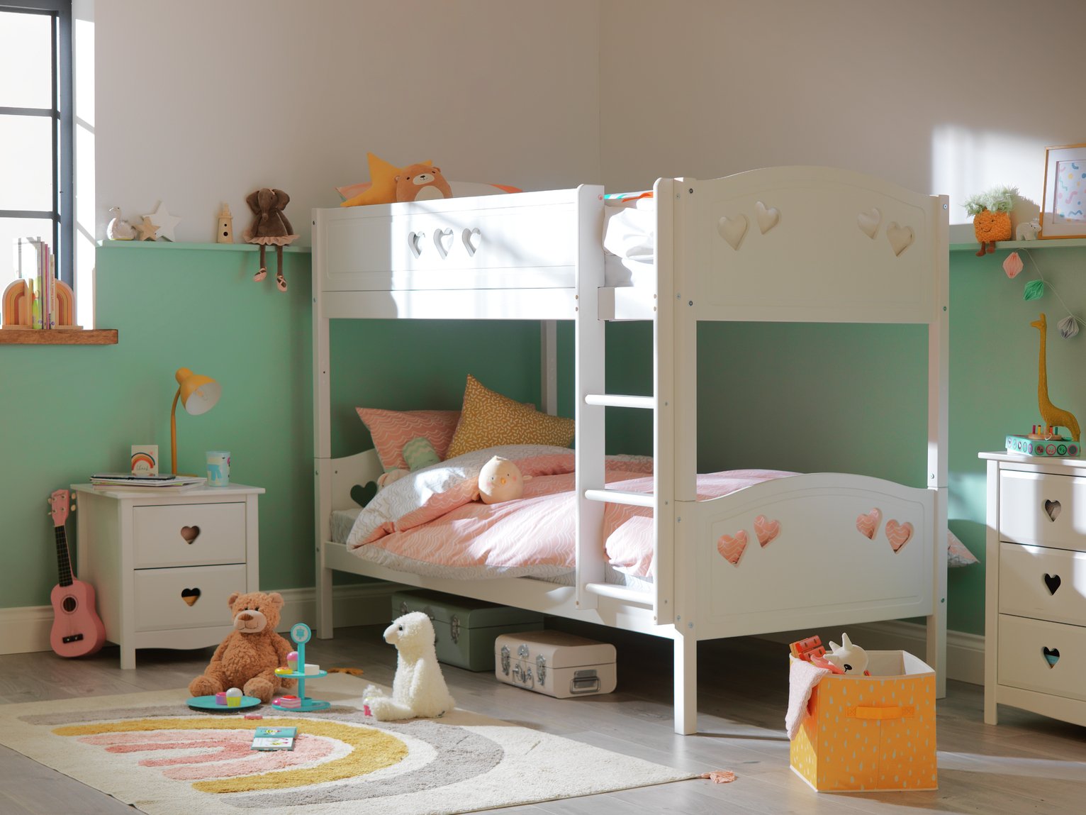 Dream a dream with the detachable Mia bunk bed. With solid wood elements, charming cut out heart decorations, and elegant bevelled edges, this is a