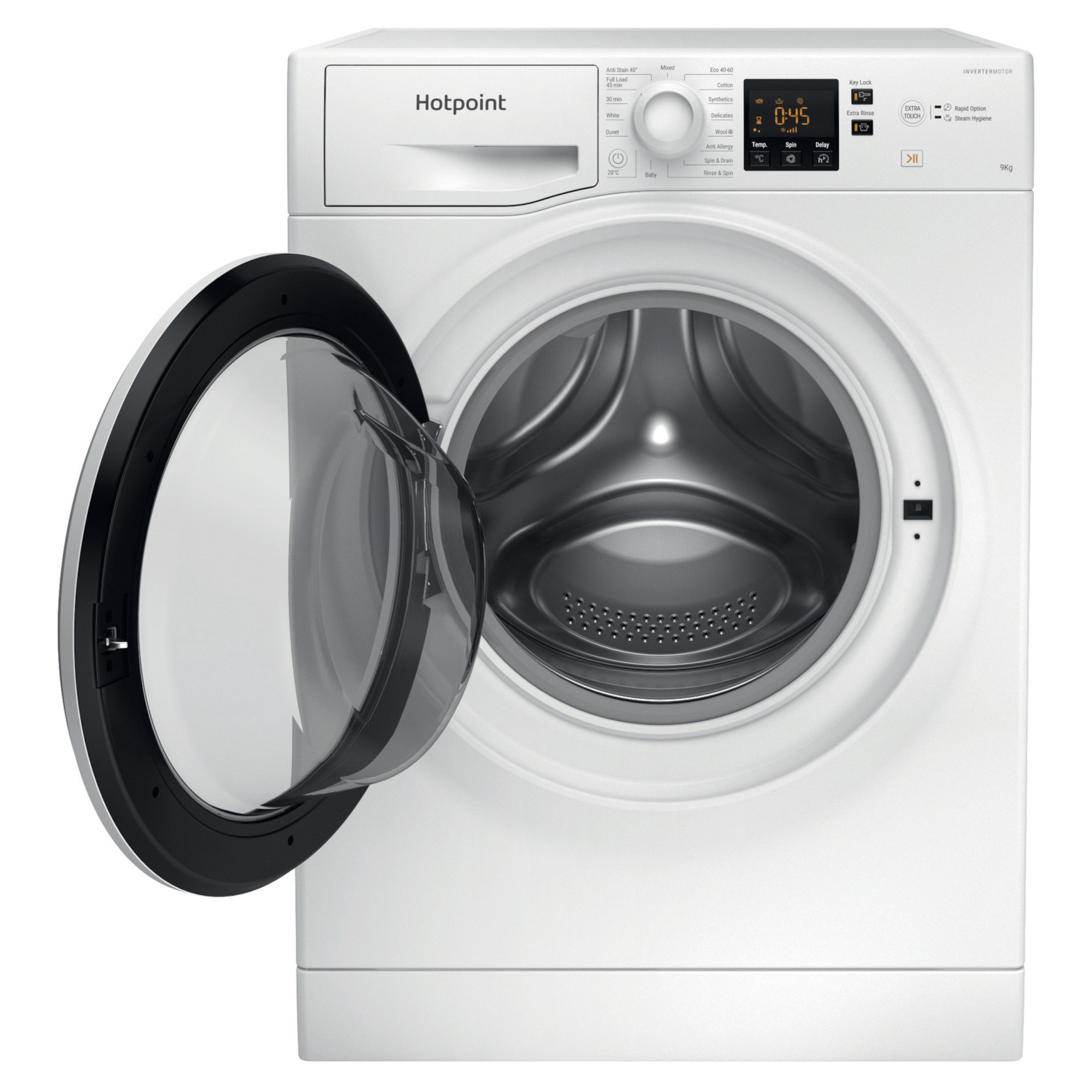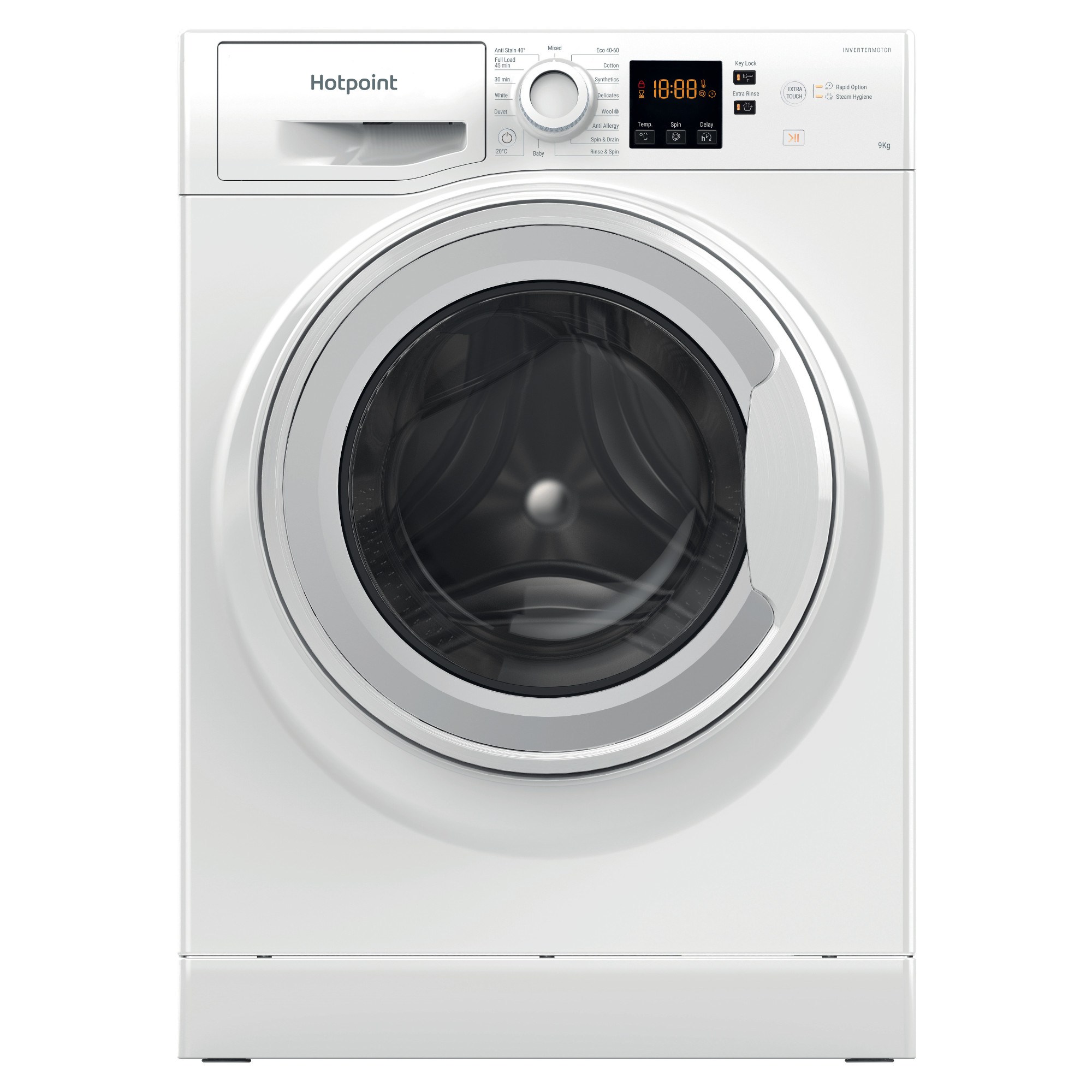 9kg Wash Load Capacity 1600rpm Spin Speed 16 Programmes Steam Hygiene Cycle Delay Function Rapid Option H:850mm x W:595mm x D:605mm White Finish Hotpoint NSWM 965C W UK N 9kg Load Capacity 1600rpm Spin Speed Washing Machine with Steam Hygiene – White With a 9KG load and 45 Minute full load, the NSWM965CWUKN is perfect for busy lifestyles. The ability to select the Rapid option allows you to reduce your wash cycles by up to 50% whilst still providing a quality wash for your clothes. (This percentage will vary depending on wash cycle chosen.) An Anti-Stain cycle removes common stains without the need for pre-treatment, saving you time and money. The dedicated programme uses a combination of temperature, drum movements, water usage and detergent to achieve great results when it comes to stain removal. The NSWM965CWUKN gives its most hygienic wash when using the additional Steam option. By injecting steam directly into the drum after a completed cycle, it can remove up to 99.9% of bacteria without the need for harmful chemicals. Paired with an Antimicrobic Door Seal that reduces bacteria build up by 99.9%, you can relax in knowing your machine is clear of unwanted bacteria and germs.