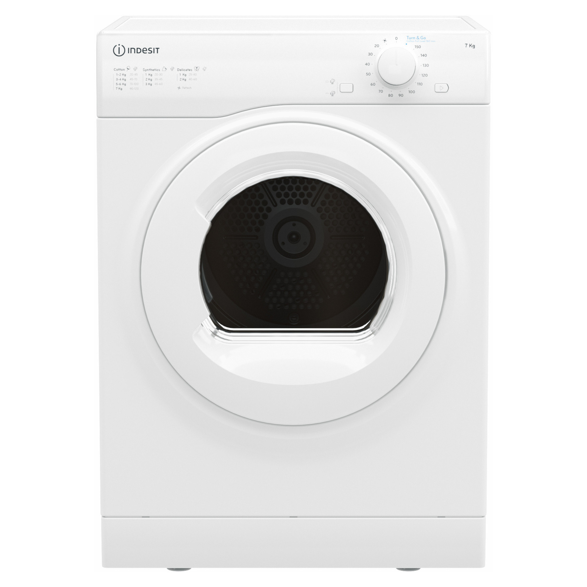 H:850mm x W:595mm x D:610mm Vented Design 8kg Drum Capacity C Energy Rating Full Size Design Indesit I1D80WUK Air-Vented 8kg Load Capacity Tumble Dryer – White For an easy to use way to dry your freshly cleaned laundry choose the Indesit I1 D80W UK Freestanding Tumble Dryer. Using air vented technology, you can dry up to 8kg of wet fabrics in an efficient way. Select your drying time with the dial selector for cycles between 20mins to 160mins. Choose from Low or High Heats to suit your fabrics. The refresh helps give your clothing a quick airing. The Standard cotton programme is idea for your cotton clothing and sheets. Start or Pause to add, remove of check on the progress of your load. All this finished in classic white.