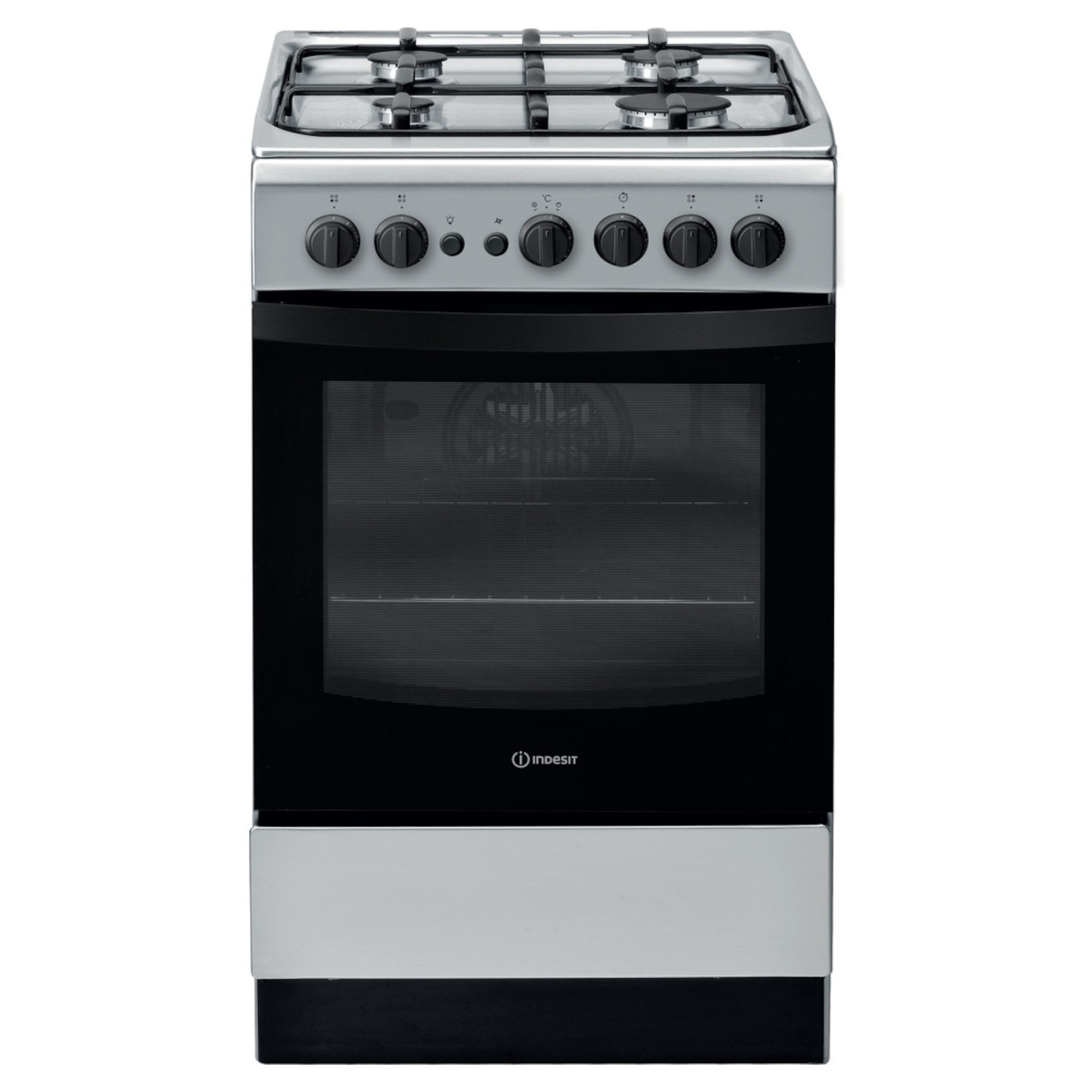 Click&Clean – Cleaning your oven door is quick and simple with the effortless Click&Clean function Combined Grill Dial Controls 4 Burner Gas Hob 59 Litre Oven Capacity Natural Gas Single Oven H:900mm X W:500mm X D:600mm Indesit IS5G1PMSSUK 4 Hob Single Gas Cooker With the IS5G1PMSSUK you will get a great value Indesit gas cooker available in a stylish stainless steel colour which will make an excellent addition to your kitchen. The oven is 500mm wide meaning that this cooker won’t take up any room in your kitchen. It is gas powered and will also come with a gas grill meaning that all of your food can be cooked in a super-efficient time which will help you save both money, time and effort. The hob will come with 4 burners in 3 different sizes which can suit a wide variety of pan sizes, and with an easy clean enamel pan supports and a large flame safety device for added convenience. The large 59 litre capacity oven comes with a large enamel lining, and a double glazed door which will protect your fingers from the heat, and with the built in grill, it will also come with a grill pan.