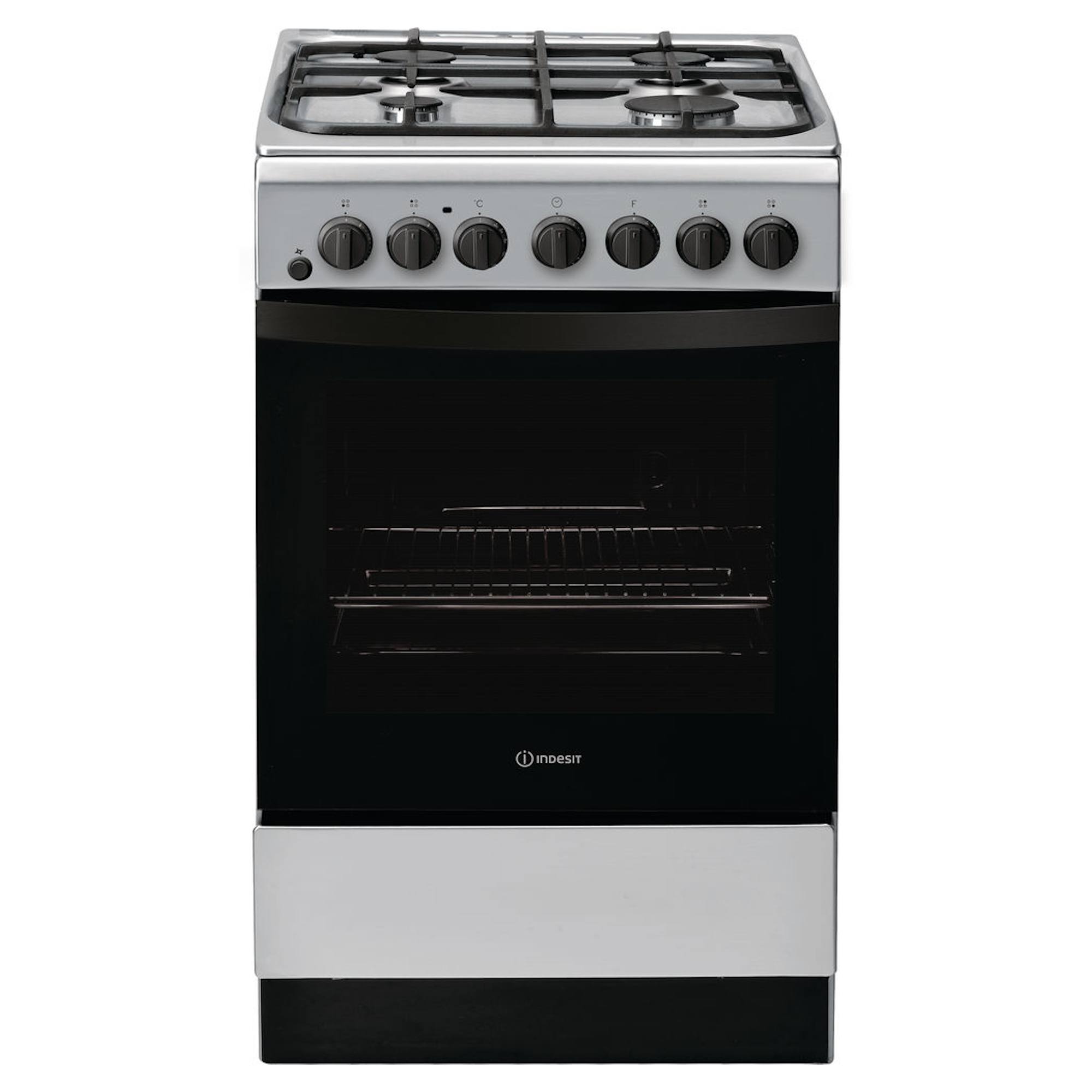 Click&Clean – Cleaning your oven door is quick and simple with the effortless Click&Clean function Combined Grill Dial Controls 4 Burner Gas Hob 61 Litre Oven Capacity Dual Fuel Single Oven H:900mm x W:500mm x D:600mm Indesit IS5G4PHSS 50cm Freestanding Dual Fuel Cooker The Indesit IS5G4PHSS 50cm Freestanding Dual Fuel Cooker allows you to add the perfect finishing touch to your kitchen. It has a single conventional oven which gets hotter higher up inside the cavity as heat rises, this means you can cook your main dish in the middle of the oven, something that needs a bit of extra heat at the top and maybe a desert at the bottom to help deliver the perfect meal. The handy defrost feature allows you to thaw your meat in no time, this is perfect for either last minute decisions or if you happen to forget to get your frozen meat out of the freezer in time. This oven also features a timer which means you will never have to worry about over cooking your food again, simply set the timer and the oven will alert you when that time is up so you can go check on your food. The 4 gas burners offer plenty of space to boil your vegetables or help to deliver the perfect fry up. All of the features can be easily adjusted using the dials on the front of the oven for precision cooking. Another handy feature is to help you keep your oven clean, it uses steam to soften any food residue which allow syou to effortlessly wipe it clean once the oven has cooled down.