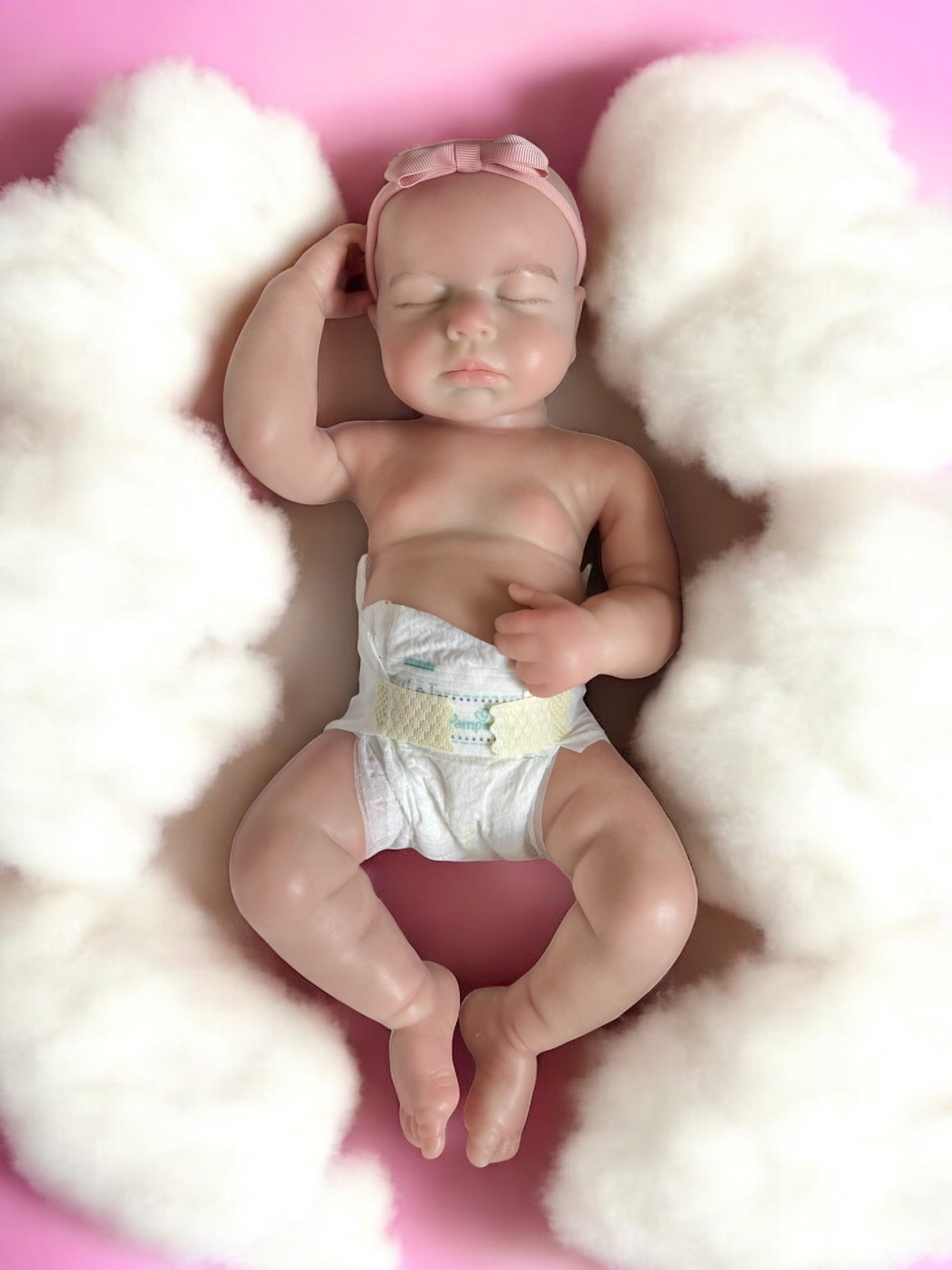 Product Features:• Full body silicone reborn baby doll• Length: Approx. 19 inches• Weight: Approx. 6 lbs (2.7 kg)• Closed eyes with a peaceful sleeping expression• Anatomically correct newborn girl• Soft silicone – flexible and lifelike feel• Realistic skin tones and subtle blushing• Comes home with: sleepsuit, vest, nappy and headband
