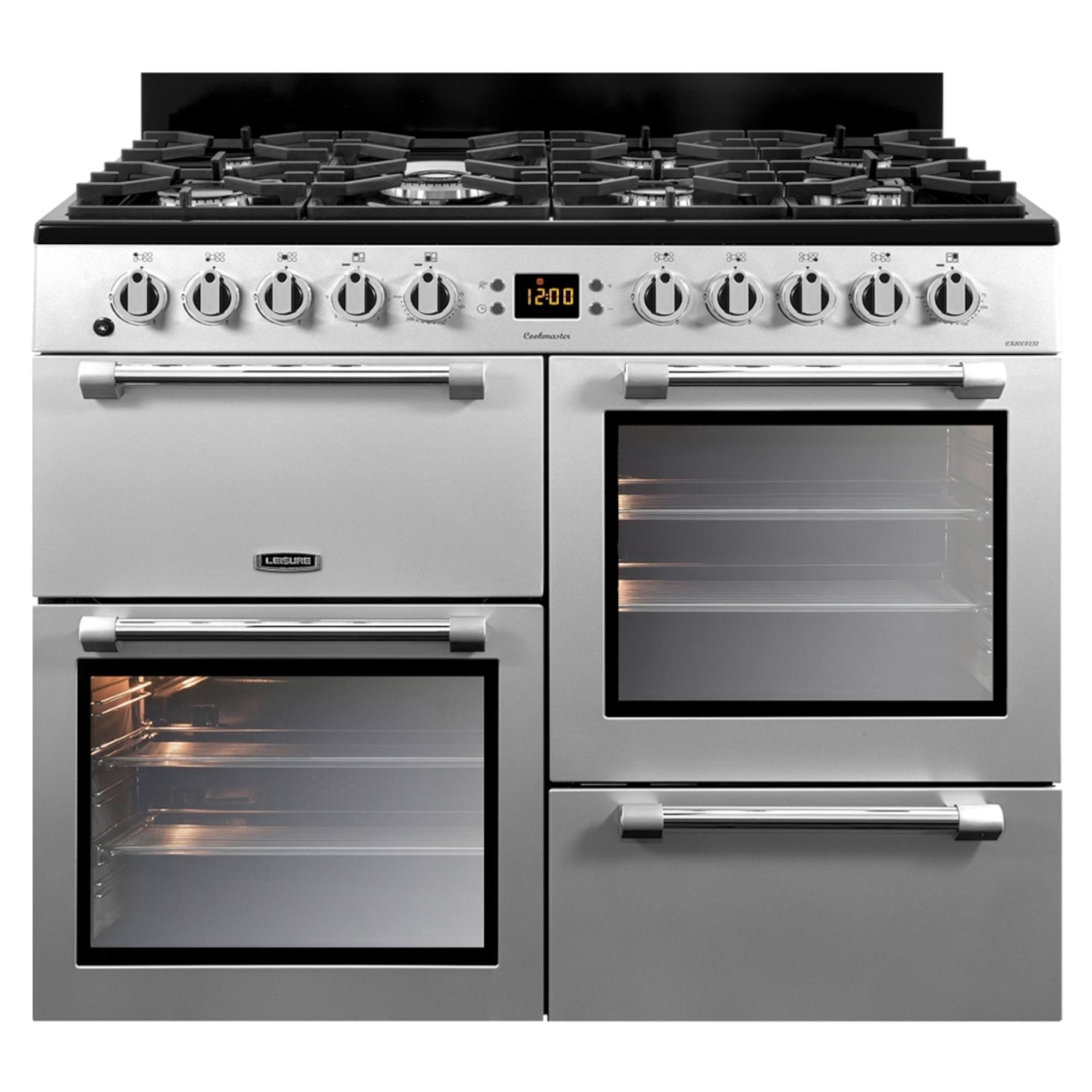 Dual Fuel  Double Oven  7 Gas Burner Hob  Storage Compartment  H:900mm x W:1000mm x D:600mm  Wok Burner Culinary Excellence and Elegance: Leisure CK100F232S 100cm Cookmaster Dual Fuel Range Cooker in Silver Experience the pinnacle of culinary convenience and style with the Leisure CK100F232S 100cm Cookmaster Dual Fuel Range Cooker in elegant Silver. This kitchen masterpiece harmonizes innovative technology with a sleek design, becoming the focal point of any modern kitchen. With its spacious cooking capacity and dual fuel capabilities, this range cooker empowers you to create culinary wonders with ease. Standing at an impressive 100cm, the Cookmaster offers ample cooking space to accommodate both intimate meals and grand gatherings. The combination of gas hobs and electric ovens ensures precise temperature control and efficient cooking performance. The Silver finish adds a touch of sophistication to your culinary space, while the user-friendly control panel guarantees intuitive operation, making your cooking endeavors a delightful experience. Unleash your culinary creativity and infuse your kitchen with timeless elegance through the Leisure CK100F232S 100cm Cookmaster Dual Fuel Range Cooker. Whether you’re a seasoned chef or an enthusiastic home cook, this cooker’s advanced features and captivating Silver design promise to redefine the art of cooking, enabling you to craft exquisite dishes while transforming your kitchen into a culinary haven that effortlessly blends style and functionality.