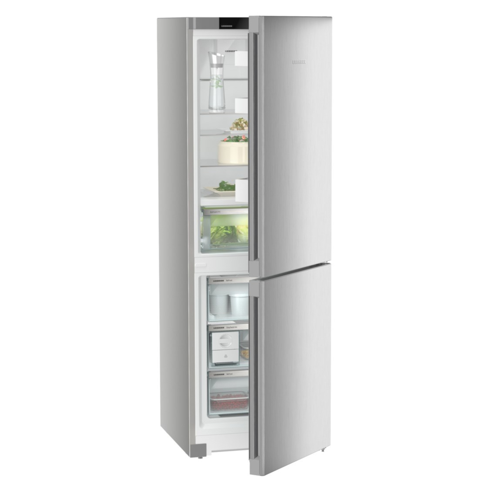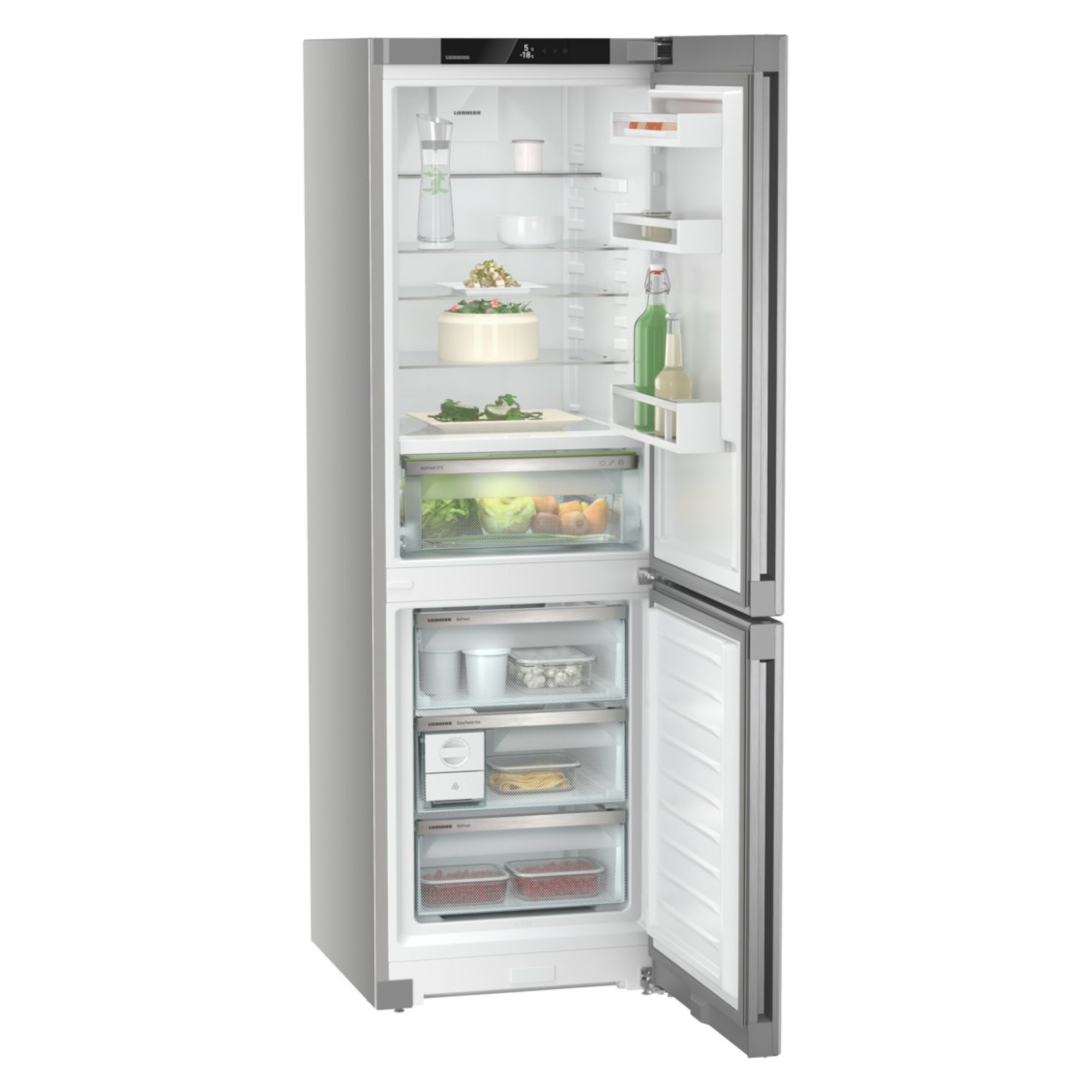 NoFrost DuoCooling Touch Display 320 L H:185.5 x W:59.7 x D:67.5 cm Liebherr CBNSFC522i Plus BioFresh NoFrost Fridge Freezer – Silver When you open your freezer, you want to see frozen food and certainly not ice and frost. NoFrost protects the freezer compartment from unwanted icing, which consumes a lot of energy and can be expensive. NoFrost means no more tedious and time-consuming defrosting of the freezer compartment, more time for other things and saving money. Crunchy salad and strawberries: the most delicate foods deserve a special place so they stay fresh longer in BioFresh safes. In the Fruit & Vegetable safe the temperature is close to 0C. Combined here with the constant humidity, thanks to the air-tight closure, unpackaged fruit and vegetables feel particularly at home. You do not have to adjust anything. DuoCooling uses two completely separate refrigeration circuits to ensure no air is exchanged between the fridge and freezer compartments. The food neither dries out nor is odour transferred. This means throwing less away, shopping less often, but saving more and greater enjoyment. Your Liebherr may well be standing in the kitchen but if you want, it can also be connected to the Internet at any time. The integrated SmartDeviceBox opens the door to all the Smart Home benefits. Simply plug it in, switch it on and connect your Liebherr to the network via Wi-Fi. Fingertip control: the touch display enables easy and intuitive operation of your Liebherr. All functions are clearly arranged on the display. By gently tapping a finger, for example, you can easily select the functions or check the current temperature of your refrigerator. Do you love cool elegance in your kitchen? If yes, then a Liebherr with a SteelFinish surface is just for you. The colaminate material with vertical brush effect looks very similar to stainless steel, is robust and easy to clean. The painted silver-coloured side walls complement the elegant look perfectly.