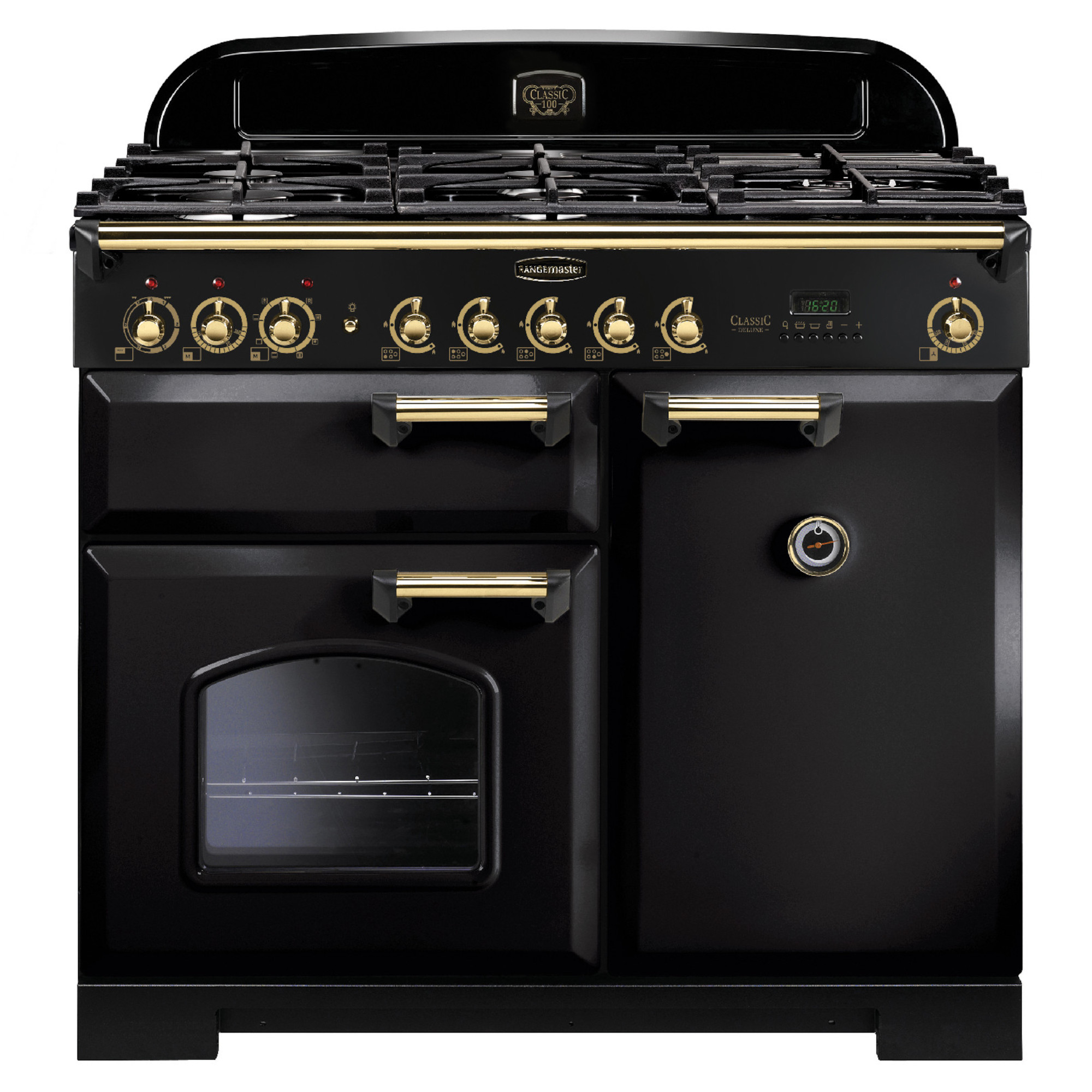 Dual Fuel Range Cooker   79L / 82L Capacities   5 Gas Burner Hob   Catalytic liners   A/A Energy Ratings Rangemaster CDL100DFF Classic Deluxe 100 Dual Fuel Range Cooker – Black with Brass Trim Imbued with an ultra-chic style that makes this collection a firm favourite among those with more classical tastes. Catalytic liners, cook clean liners absorb fat and steam during cooking and release these deposits to the base at a temperature of more than 200 degrees Celsius, ensuring that the oven is kept as clean as possible with minimal effort. There is also a Wok cradle that is robust, durable, and hard to wear for stable wok cooking, easy to remove and safe to clean. All this with the bevelled doors and arched glass viewing windows, ideal for a traditional kitchen decor. Click HERE for User Manual.