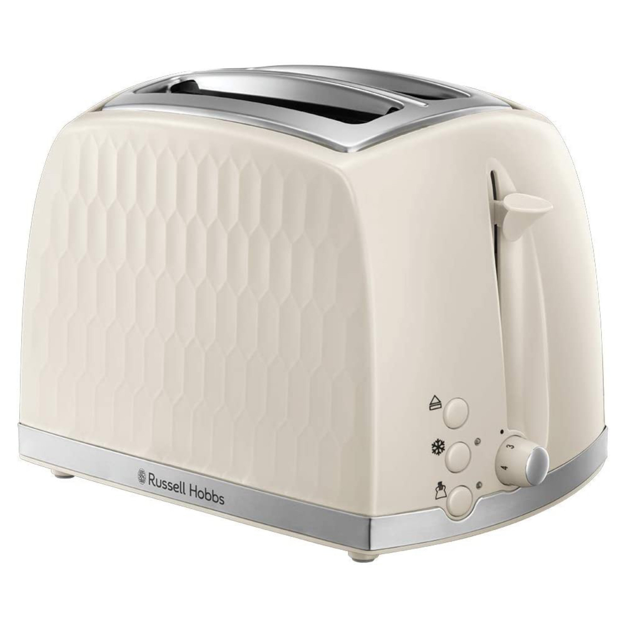 Toast 2 slices at one time High Lift Function Reheat toast quickly and easily Select your perfect setting for golden brown toast Handy removable tray lets you dispose of crumbs easily The Russell Hobbs Honeycomb 26062 2 Slice Toaster delivers the perfect slice of toast effortlessly. This toaster comes with different browning levels and allow you to toast your bread exactly how you like it. Whether you like it soft and fluffy or burnt to a crisp, this toaster allows you to tweak it to how you like it. If you find yourself doing another job when your toast pops up, fear not, this toaster features a handy reheat setting which will have your toast heated back up and ready to eat in no time. If you fancy a crumpet or teacake instead then the high-lift feature means you wont have to worry about burning your fingers when reaching into the slot. Cleaning up after you’ve made your toast couldn’t be easier thanks to the removable crumb tray.