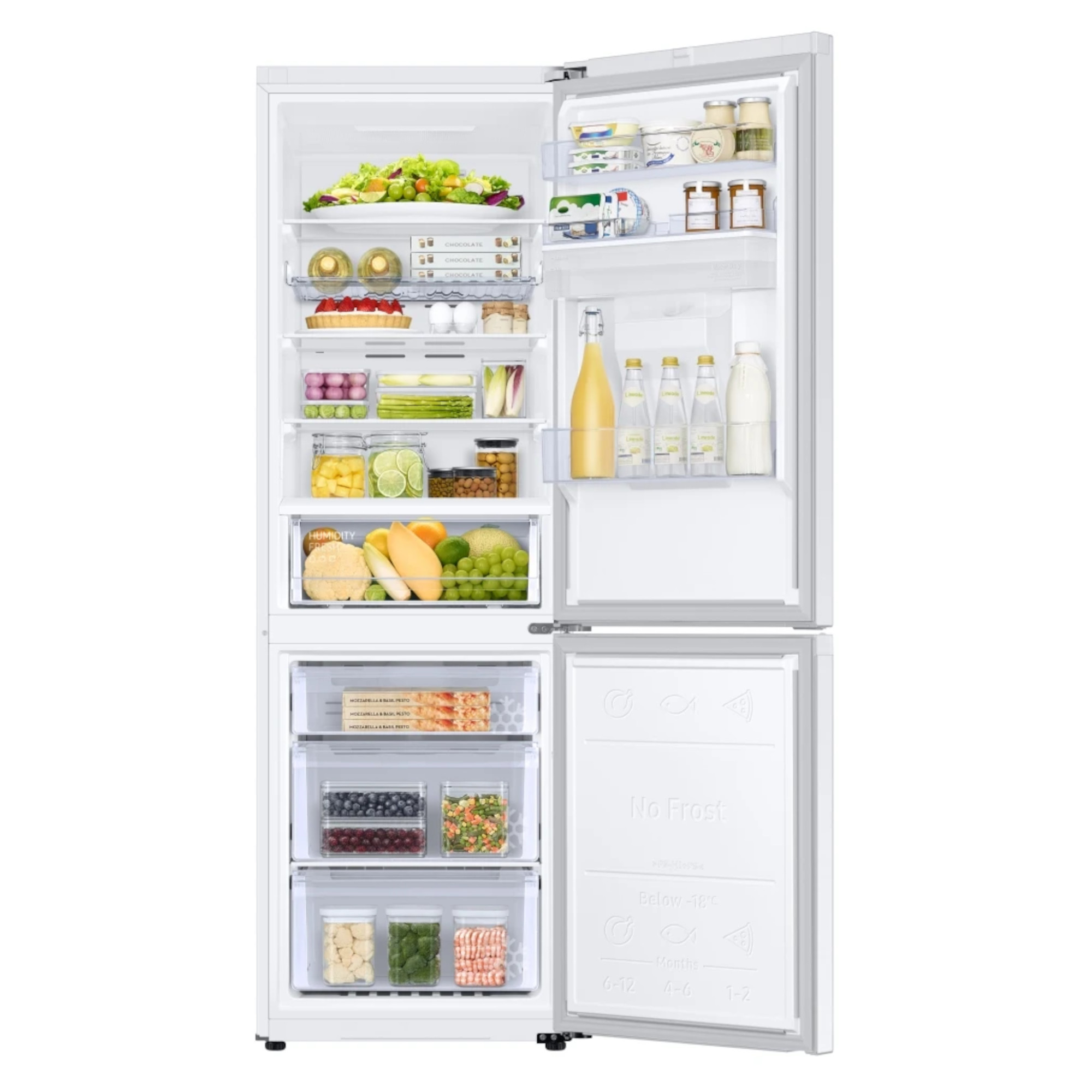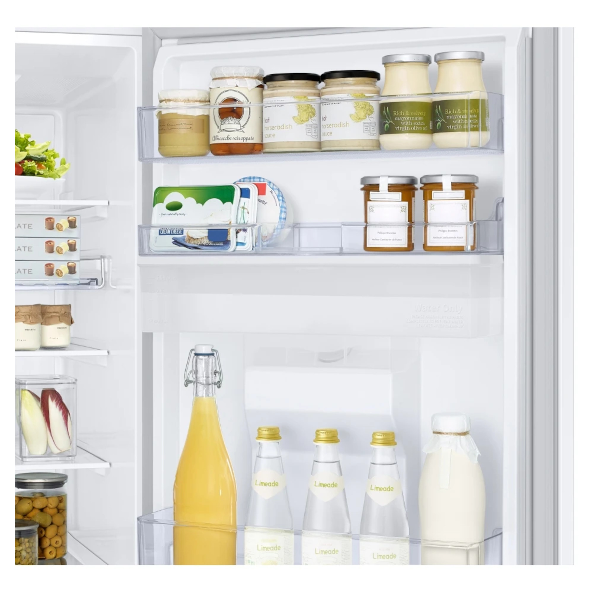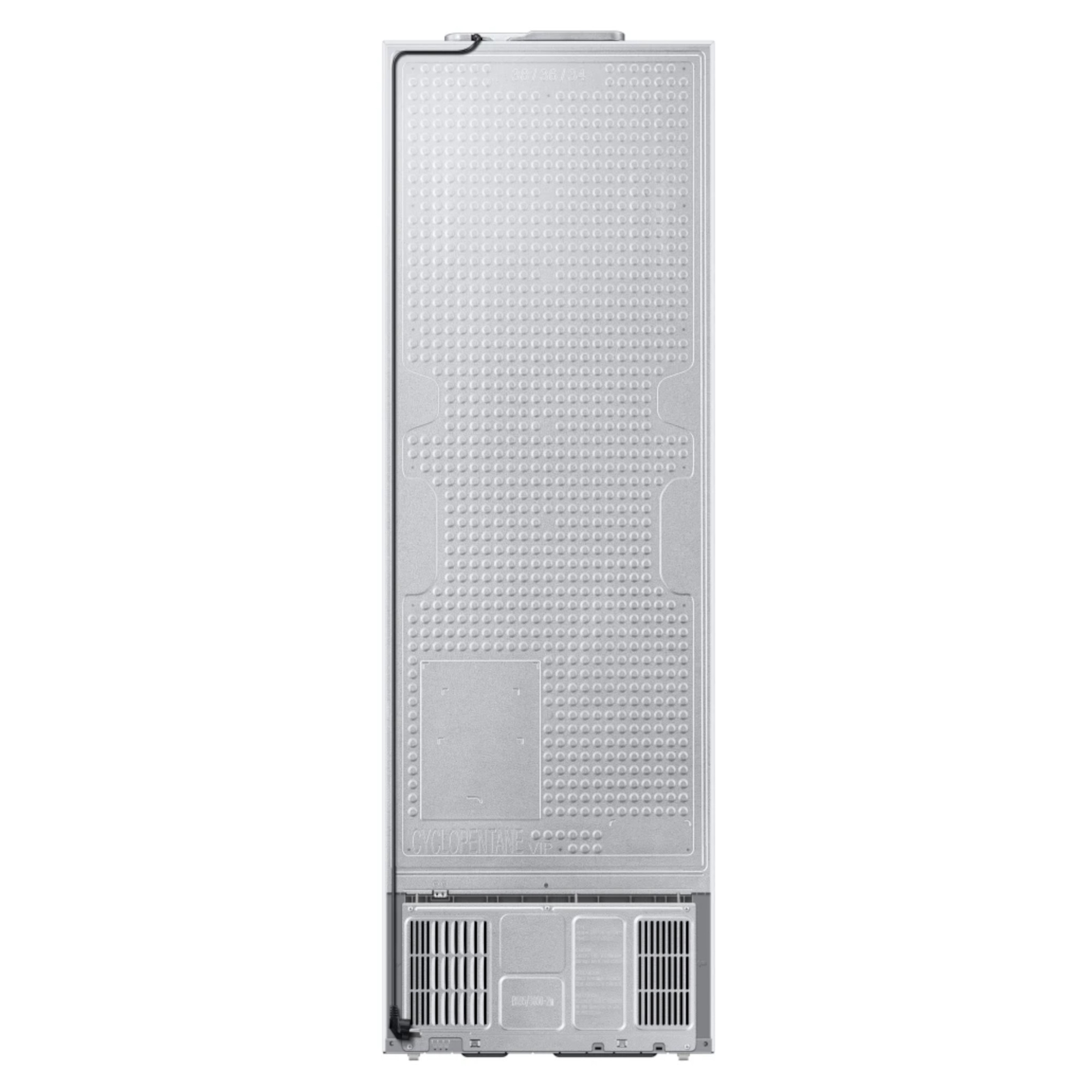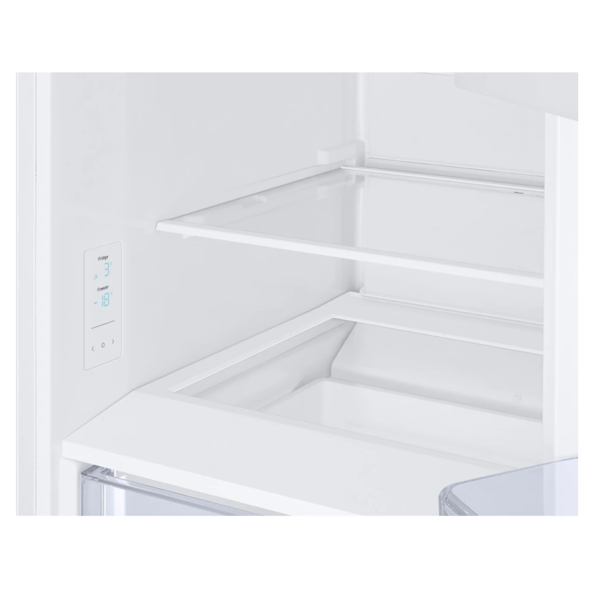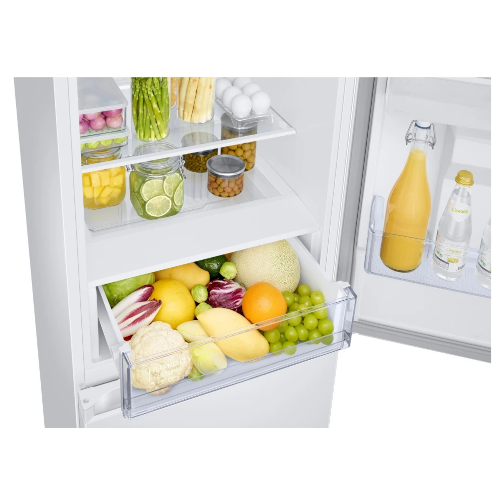 SpaceMax Technology Frost Free Wine Shelf All-Around Cooling Seamless and Sleek Design The Samsung RB34T632EWW Frost Free Fridge Freezer has been packed with impressive features and technology to ensure your food is kept in the best possible conditions to help keep it fresher for longer. Thanks to the SpaceMax Technology your fridge freezer will feel much bigger. It works by making the walls slimmer so the same size fridge on the outside has a larger capacity on the inside. And that without compromising on the performance or the energy efficiency. The Total No Frost feature maintains an even temperature and prevents the build-up of ice to ensure you won’t have to manually defrost your new appliance. The specially designed Wine Shelf keeps all of your favourite drinks nice and chilled. It features an extra-wide wine rack which means it is perfect for those slightly larger champagne bottles, meaning you are always ready for that special occasion. As this wine rack features a new flatter design, if you dont want to store your favourite drinks there, you can now use it for storing wider items such as pizzas which aren’t always the easiest to place. The fridge compartment features All-Around Cooling which moves cool air around the fridge to help keep a constant temperature. This means everything from meat to cucumbers will always be evenly chilled and stay fresher for much longer. We all know how filthy the exposed cables and coils on the back of a normal fridge get, and no one wants that in their kitchen. So weve made this refrigerator cleaner and a lot more durable with a metal Clean Back cover. That means its easy to keep pristine just give the smooth surface a quick wipe and the inner workings are nicely protected from any bumps and knocks. The slim and streamlined water tank means theres more storage space in the door. So you can free up your shelves and cut the amount of time spent rummaging for your spreads. The water tanks flat top has even been transformed into a shelf so you can use the space to store pots and jars. Its perfect for frequently used butter and jams, or for easy access snack storage. Just grab, go and enjoy.