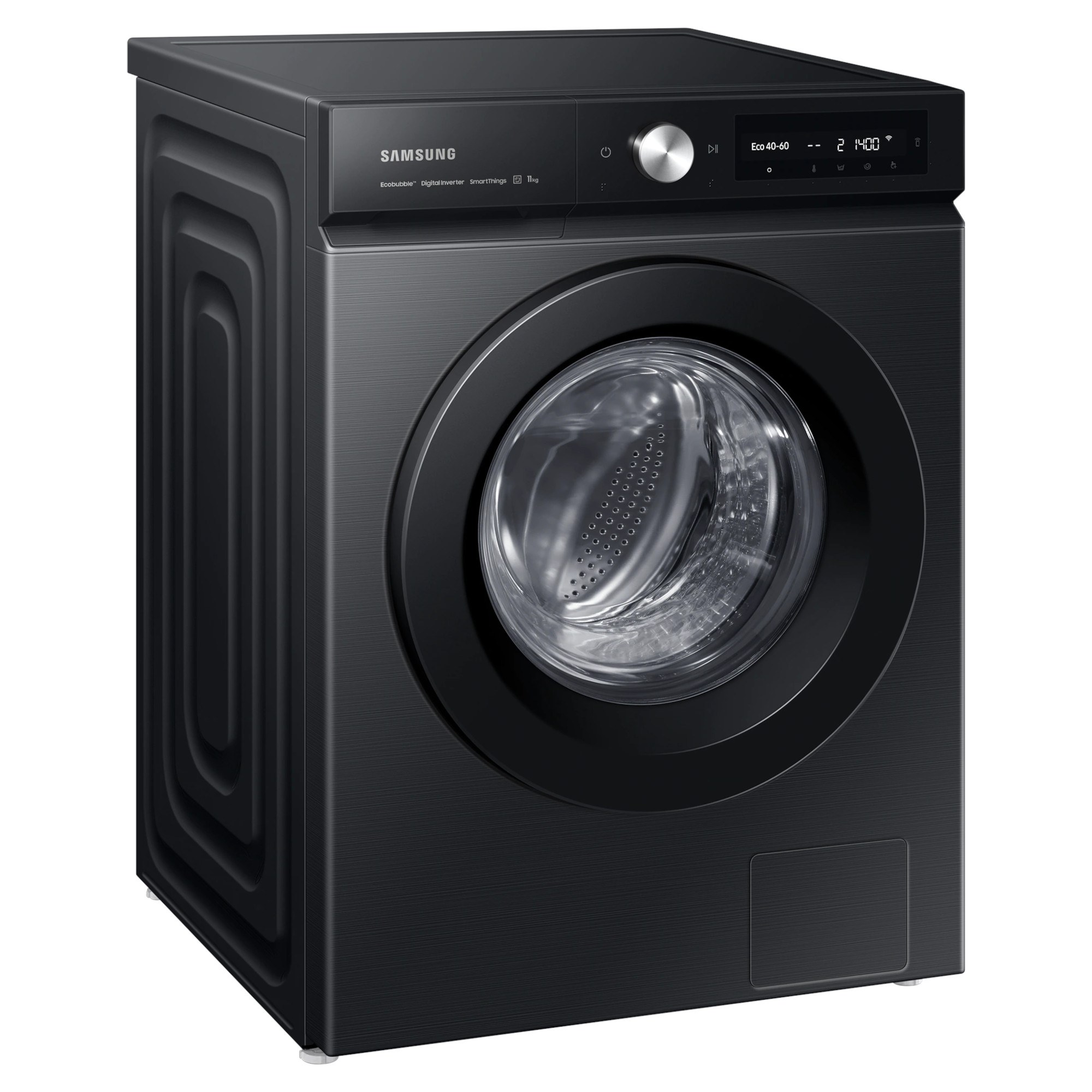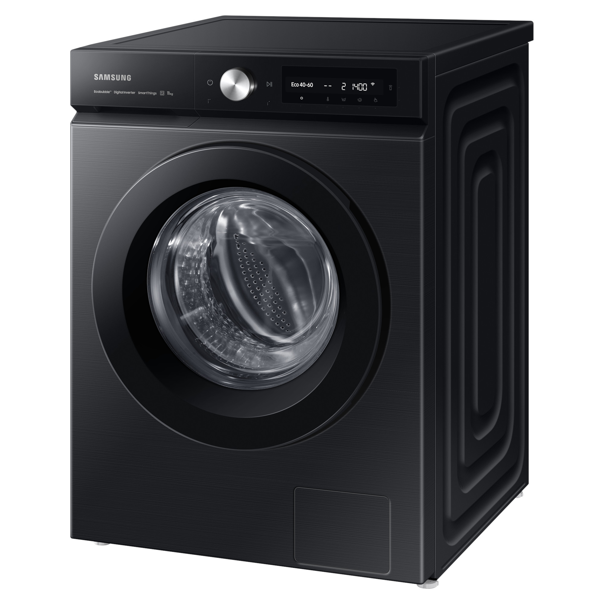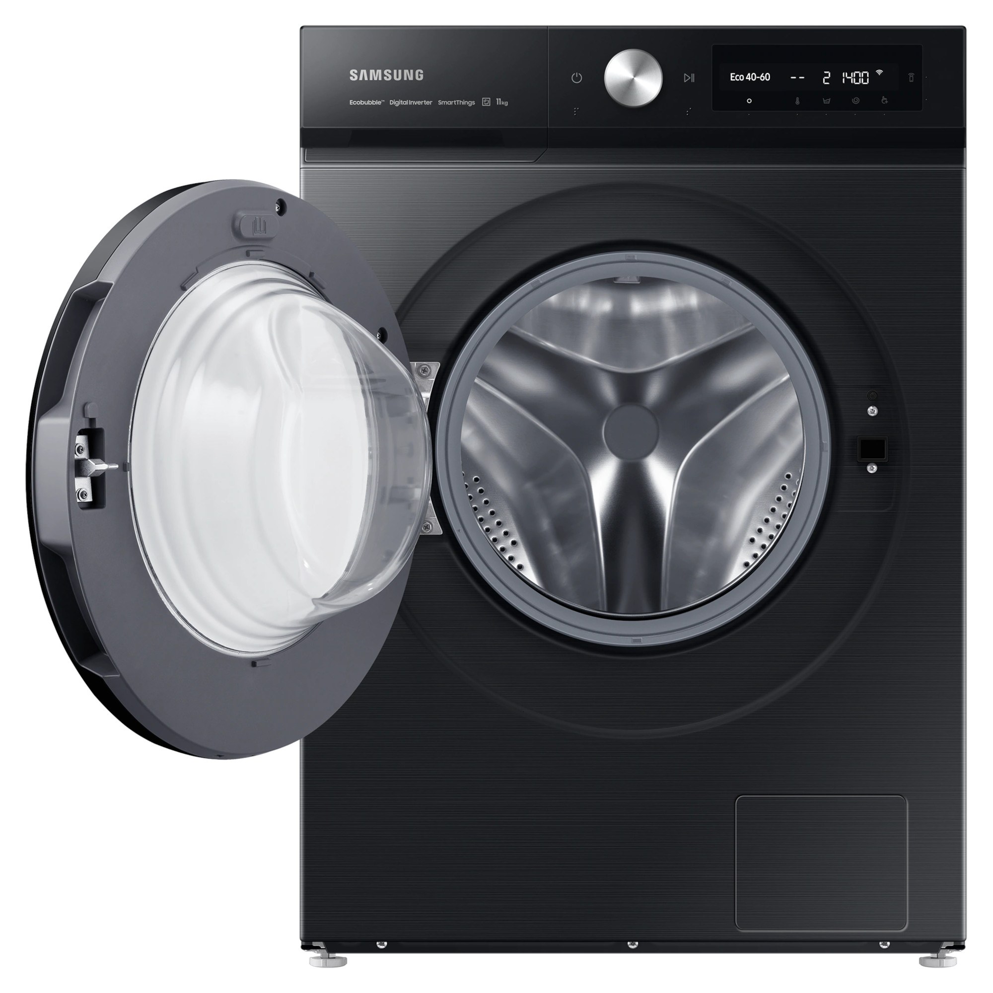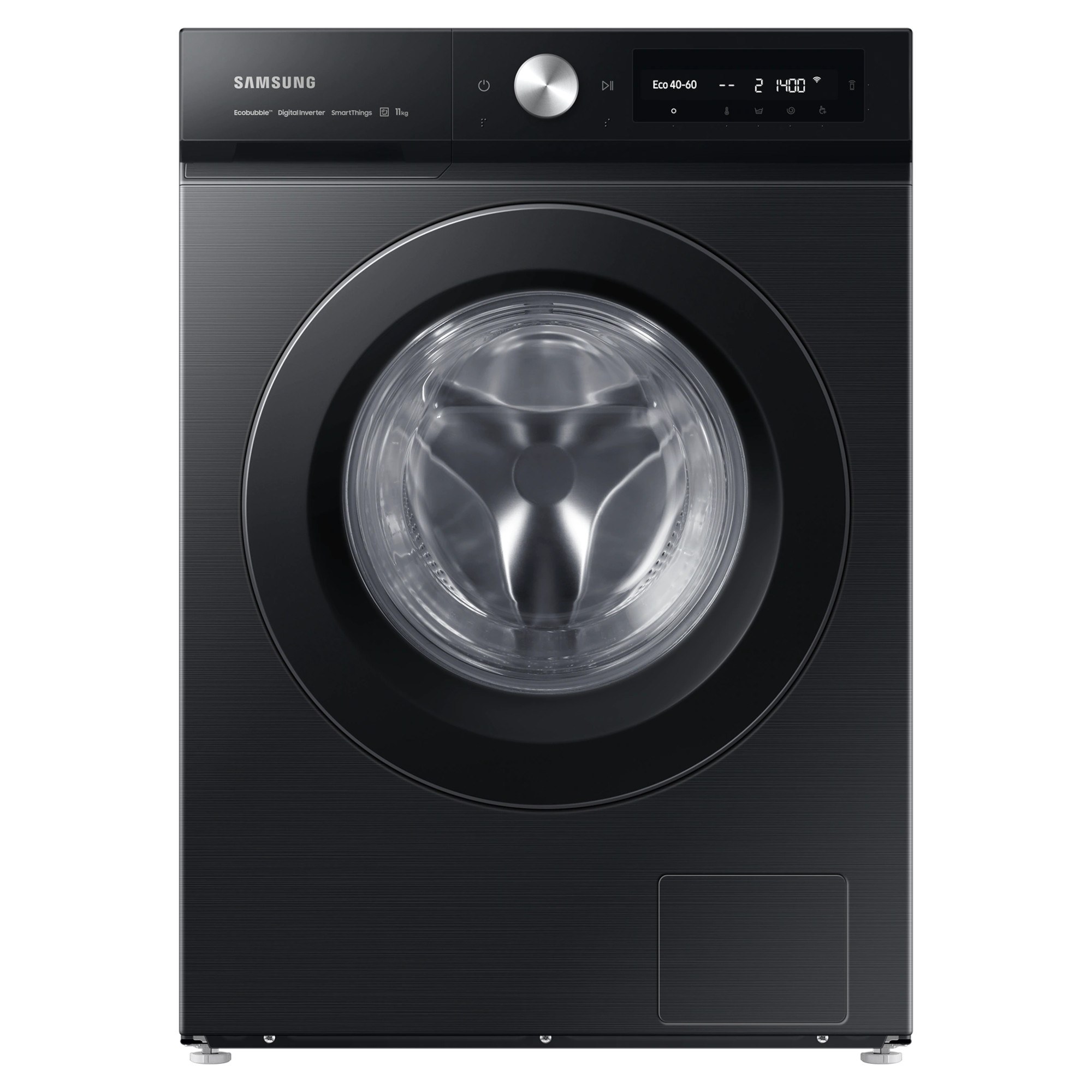 11kg Load Capacity 1400rpm Spin Speed ecobubble & SpaceMax Design Digital Inverter Technology A Rated 72dB Noise Rating A Energy Rating H:850mm x W:600mm x D:600mm Black Finish Samsung Series 5+ WW11BB504DABS1 Bespoke AI 11kg Washing Machine with ecobubble & SpaceMax Give your home the incredible capacity and intelligent flexibility of your new Samsung Series 5+WW11BB504DABS1 Bespoke AI Washing Machine. From the SpaceMax 11kg drum that give you more capacity without exceeding the footprint of a standard washing machine to the ecobubble technology that uses a precise mix of air, water and detergent to provide a flurry of bubbles to ensure cooler temperature settings to clean as well as higher temperatures to save on your energy bills. Thanks to the Digital Inverter Technology your new washing machine can not only provide spin speeds of up to 1400rpm but had been designed to last. With the AI Control system you can control your wash as never before. From personalising your washing cycles by remembering your habits to recommending cycles and proving live information via the free SmartThings App on your smartphone you can make the most out of each and every wash load. The StayClean Drawer is built to prevent soap build up in your detergent drawer to you’re your washes and machine cleaner and fresher. Keep your clothing and washing machine hygienical clean with the Hygiene Steam. By releasing hot steam into the 11kg drum you can eliminating 99.9% of bacteria and allergens or select the Drum Clean option to removes 99.9% of odour causing bacteria from your washing machines drum. After 40 cycles your Samsung washing machine will reminds to use the Drum Clean so your machine is kept to top condition.