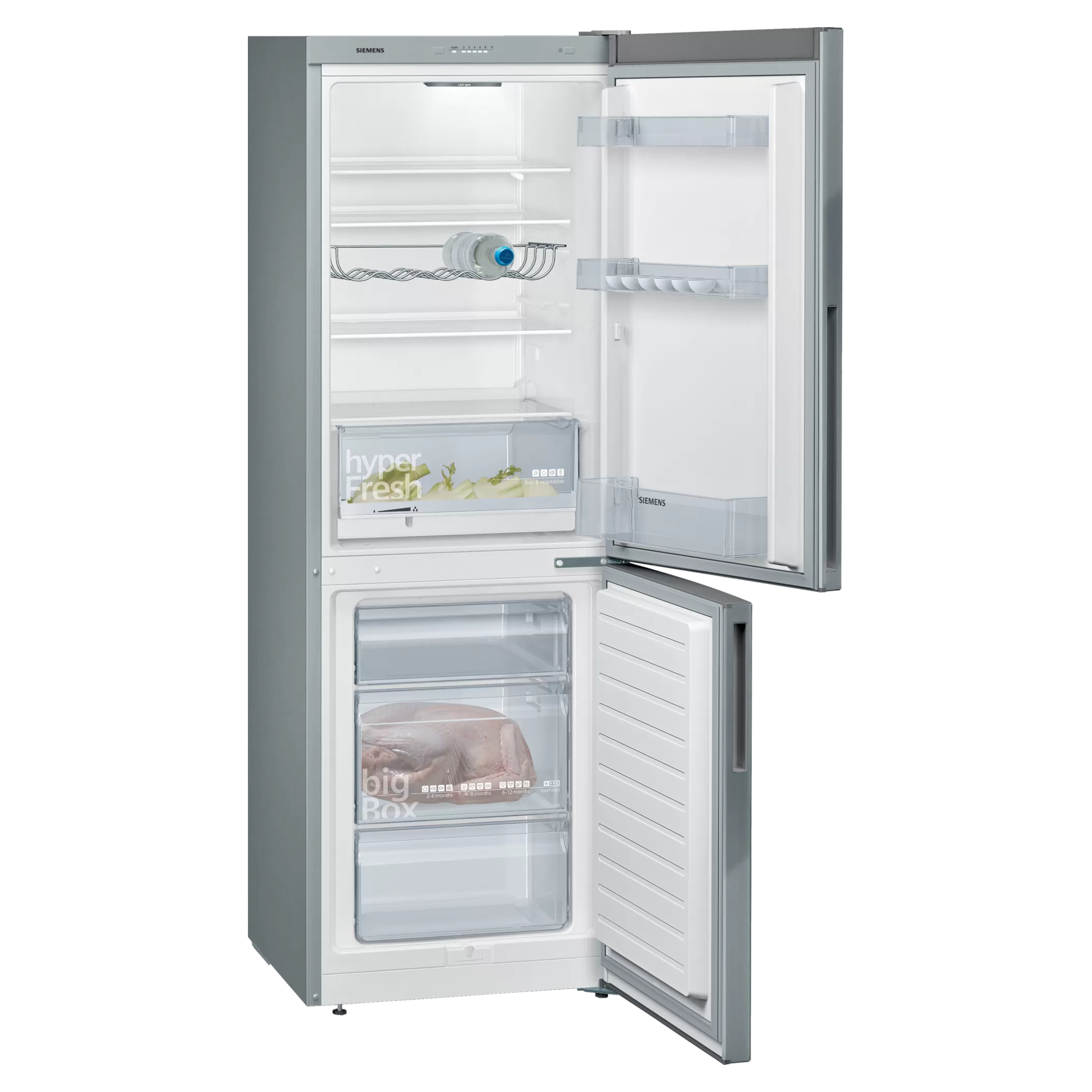 H:1760mm x W:600mm x D:650mm 195L Chill & 94L Frozen Capacity C Rated Noise Emission HyperFresh E Energy Rating Siemens iQ300 KG33VVIEAG 50/50 Fridge Freezer – Stainless Steel Refrigerators use more power when ice and frost have formed: Thanks to the innovative lowFrost technology with the special evaporator, not only is there less icing that is more homogeneous, but also defrosting is much faster than in conventional systems. The hyperFresh drawer gives you more space for your fruit and vegetables and helps maintain the right humidity. Your items stay crisp and delicious, and preserves vitamins and nutrients. Thanks to flush-mounted LED lighting, the interior of your fridge is evenly lit so you can easily check whats inside. Since the lights are cleverly mounted at the front of the fridge, your fridge contents wont dim their brightness. Even better, the LED lights are long-lasting and energy efficient. The high-quality stainless-steel surfaces of the refrigerator doors are finished with a special coating: The antiFingerprint coating puts an end to bothersome fingerprints on the stainless steel. Bottles need their own storage solution and our bottleRack delivers. Store large and small bottles and cans without them rattling inside your fridge. The snug, individual containers keep your bottles within easy reach but tucked away safely.