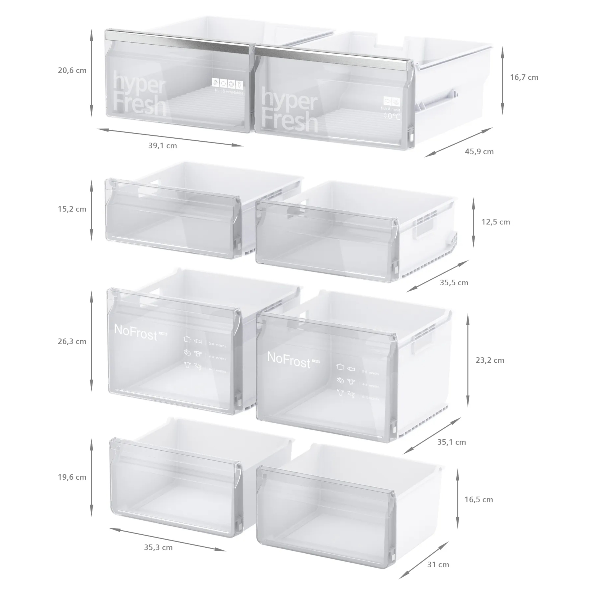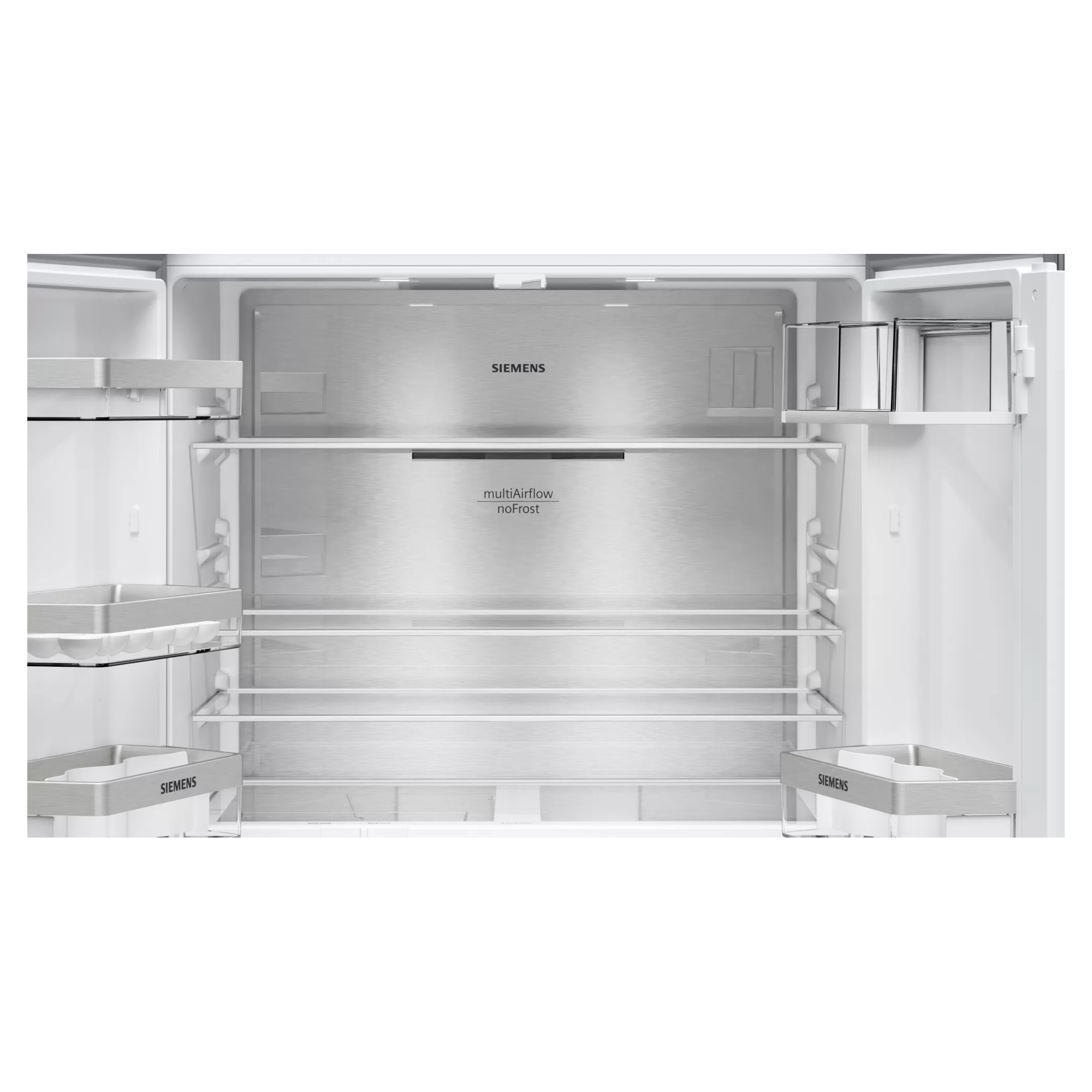 Please click here to read our American Style Fridge Freezer delivery guide before ordering. 605L Capacity No Frost Super Cool function LED Display Multi-Airflow System Smart Connectivity VitaFresh XXL Pro Touch Control With user-friendly controls and a clear LED display, operating and monitoring the temperature of your fridge freezer is effortless Introducing the Siemens KF96NAXEAG American Fridge freezer – a premium appliance that will transform your kitchen and revolutionize the way you store and preserve your food. With its expansive capacity, advanced features, and sleek design, this fridge freezer is a must-have addition to modern homes. Experience the luxury of abundant storage space with the Siemens KF96NAXEAG American Fridge freezer. Its capacious interior provides ample room for all your groceries, allowing you to neatly organize and access your items with ease. From fresh produce to frozen goods, this fridge freezer can accommodate a wide range of items, ensuring you have everything you need at your fingertips. Bid farewell to food waste with the innovative freshness technologies of the Siemens KF96NAXEAG. Equipped with VitaFresh Pro, this appliance creates optimal storage conditions, extending the shelf life of your fruits, vegetables, and meats. Enjoy the delight of crisp, flavorful produce and tender, succulent meats that remain fresh for longer periods. Experience the convenience of advanced features that simplify your daily life. The NoFrost technology eliminates the need for manual defrosting, saving you precious time and effort. The MultiAirflow system ensures even cooling throughout the fridge, preventing any hotspots and preserving the quality of your food.