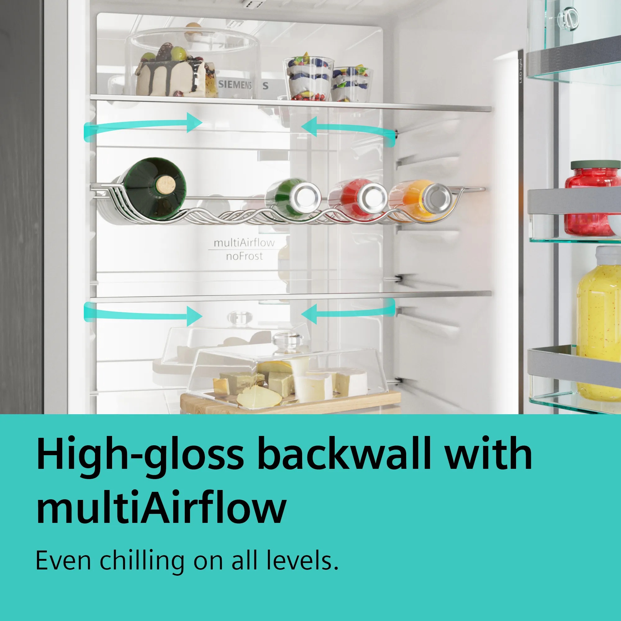 No more defrosting your freezer to keep your frozen foods preserved and your appliance energy-efficient. noFrost technology extracts humidity and keeps the air dry. This prevents frost from forming on the interior walls, or on your food, saving the effort of defrosting. It saves energy too because a frost-free freezer works more efficiently. The high-quality stainless steel surfaces of the refrigerator doors are finished with a special coating: The antiFingerprint coating puts an end to bothersome fingerprints on the stainless steel. Uneven cooling in your fridge makes it hard to keep all your food items fresh. But those days are gone. The high-gloss backwall with multiAirflow circulates air evenly for a constant temperature on all levels. Food youve placed inside recently cools quickly, and the system works hard to preserve your foods freshness. Get the space you need to store large quantities of fruit and vegetables. And for your meat and fish, theres a separate compartment with its own cold-air supply that keeps food in top condition for longer. More space and ideal storage in one system.
