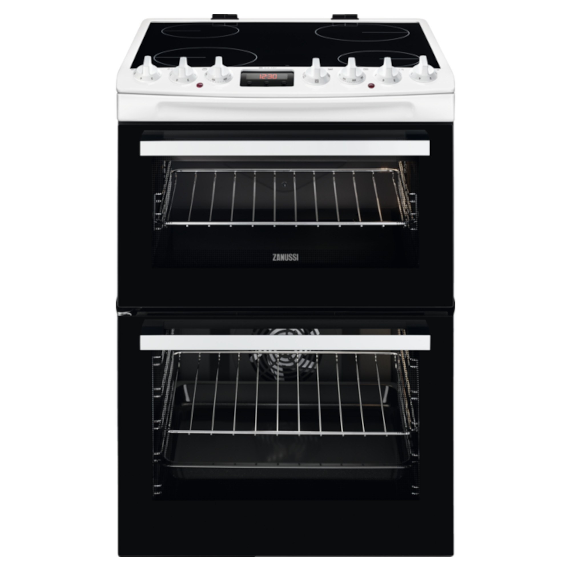 PlusSteam Function Grill Thermaflow Fan Oven Catalytic Liners Triple Glazed Doors A/A Energy Rating H:894-912mm x W:600mm x D:600mm White Finish Zanussi ZCV69360WA Electric Cooker with PlusSteam Function – White Experience efficient cooking results with the bottom fan oven, which continuously circulates air around the lower cavity ensuring even results every time without the need to turn or rotate the food.Enjoy healthier fried food with the built in Air Fryer Function. Using this function along with the inventive perforated Air Fry tray that lets the air circulate around the food from all angles removing the need to move the food gives your perfectly crunchy chips every time.For even tastier, crispier golden crust try the PlusSteam option from the multifunction cooker. This selection introduces the precise amount of steam at the start of the baking process making it simple for you to produce excellent results.Moist fan baking gives an energy efficient way of cooking bread, cakes, pizza, fish, meat and small baked items.The horizontally placed controls make it easier for you to monitor the dials at a glance thus reducing strain and the need to bend to observe the settings.Extra space for those special occasions, alongside the larger oven there is a larger baking tray to match which is 25% larger than the standard size.The multi position shelf supports are removeable for easy cleaning, and cleaning the oven cavities are an easy task thanks to the catalytic liners which absorb any grease which is then burnt off at high temperatures. Clock, programmer and minute minder make it easy for you to keep track of your cooking.The double-glazed oven doors help to maintain heat inside the cavities and also keep the outer most part cooler, they are also easily removable for cleaning.